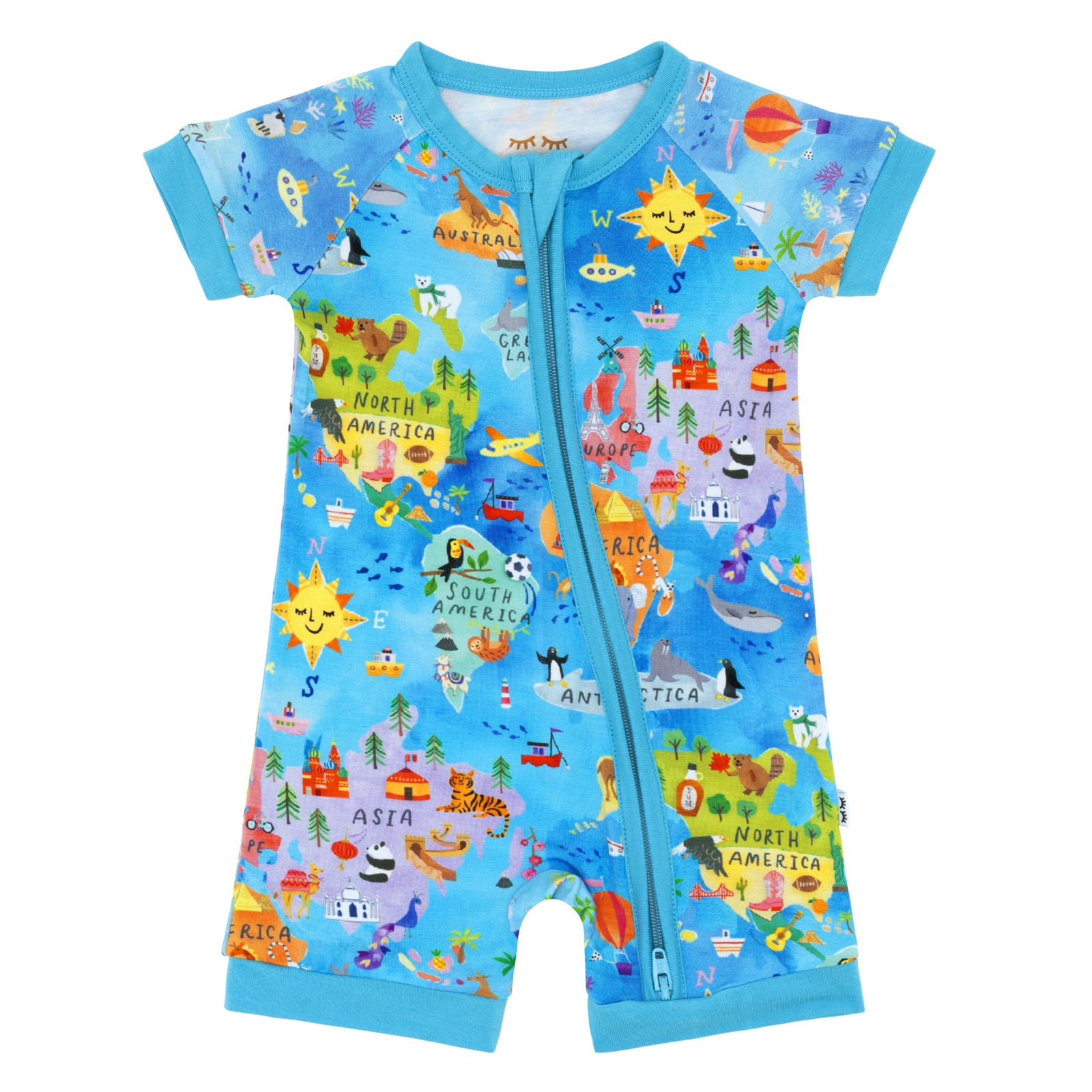 Little travelers. this one’s for you! This ocean blue Zippy features a hand painted world map with iconic landmarks and animals for your baby to discover. Made from our signature. buttery soft Lunaluxe? Bamboo. it boasts thoughtful features like a double zipper that extends down the leg and no scratchy tags. Grab a matching Crib Sheet for the sweetest photo-ops!