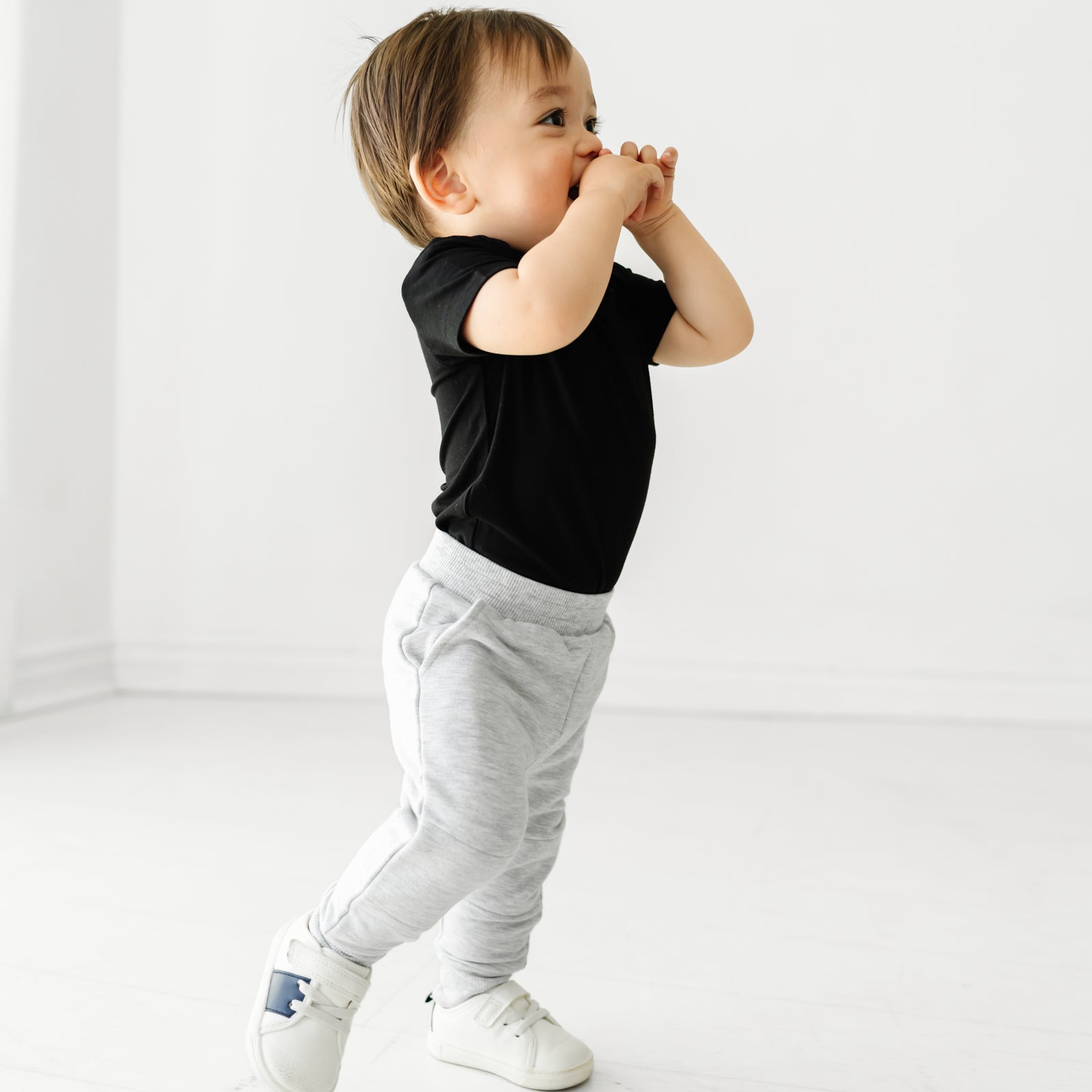A must-have basic for baby’s closet! Made from our super-soft and durable Soluxe® Bamboo. this solid Black Bodysuit keeps your little one comfortable as they snooze. crawl. or take their first steps. The lap shoulders ensure fuss-free dressing while easy snaps make changes quick and simple. We love it paired with their fave LS shorts!