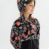 The Black Slam Dunk print features an off-black background with basketballs. jerseys. pennants. shoes. and basketball hoops. Stars and phrases such as win. dunk. dribble. and more are scattered throughout. The trim. hood lining. and pockets are off-black.