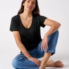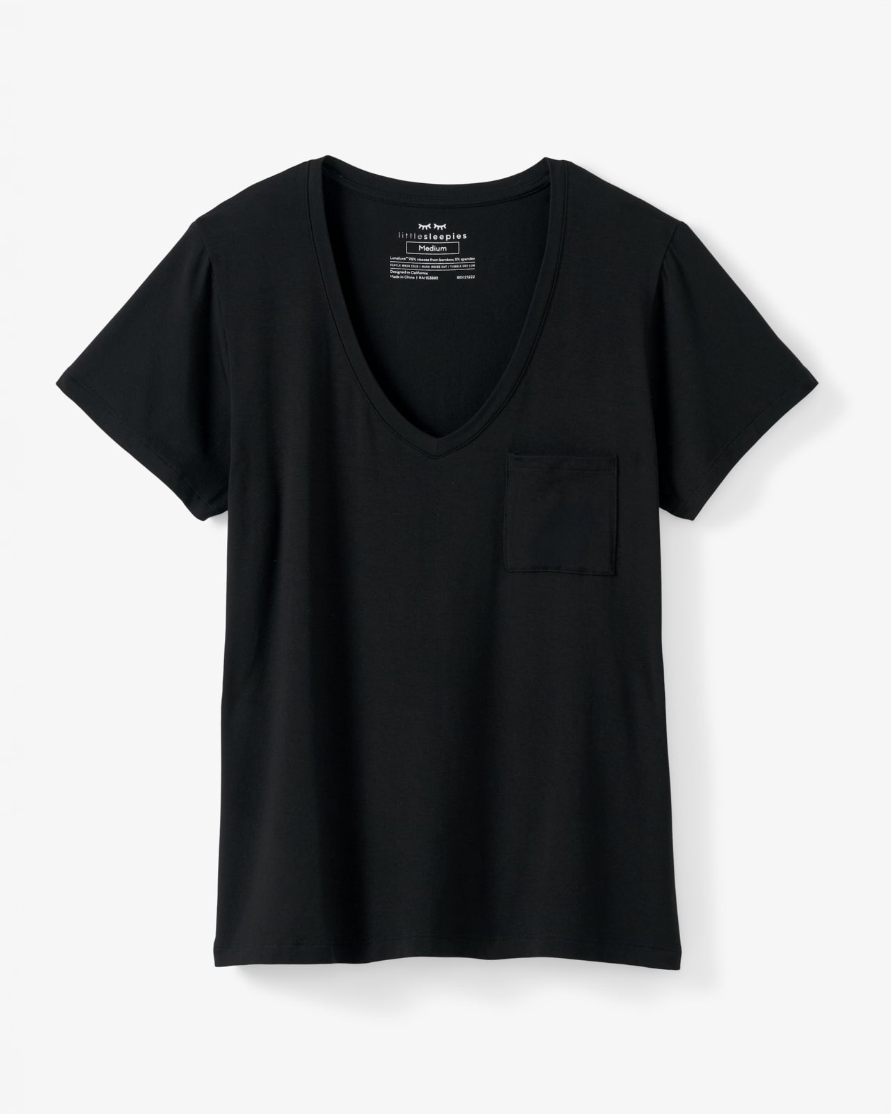 The comfiest tee you’ll ever own! Designed by a mama and made from our buttery soft Lunaluxe® Bamboo in a thicker fabrication. this Black Pocket Tee features a relaxed fit and perfect V. It’s super comfy and goes with everything from jeans to PJs. This pocket tee is classic. comfy. and dare we say??erfect.