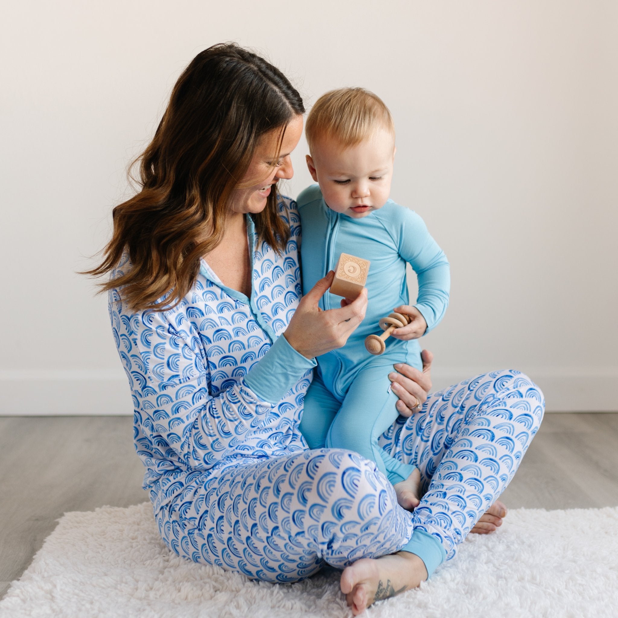 Cuddle up with the kiddos in this dreamy Blue Rainbows print. These jogger-style PJ Pants are made from buttery soft Lunaluxe® Bamboo. Designed by a mama. they feature stretchy ankle cuffs and pockets deep enough for all your mama must-haves. Pair it with the matching top to complete the set. then grab styles for your littles!