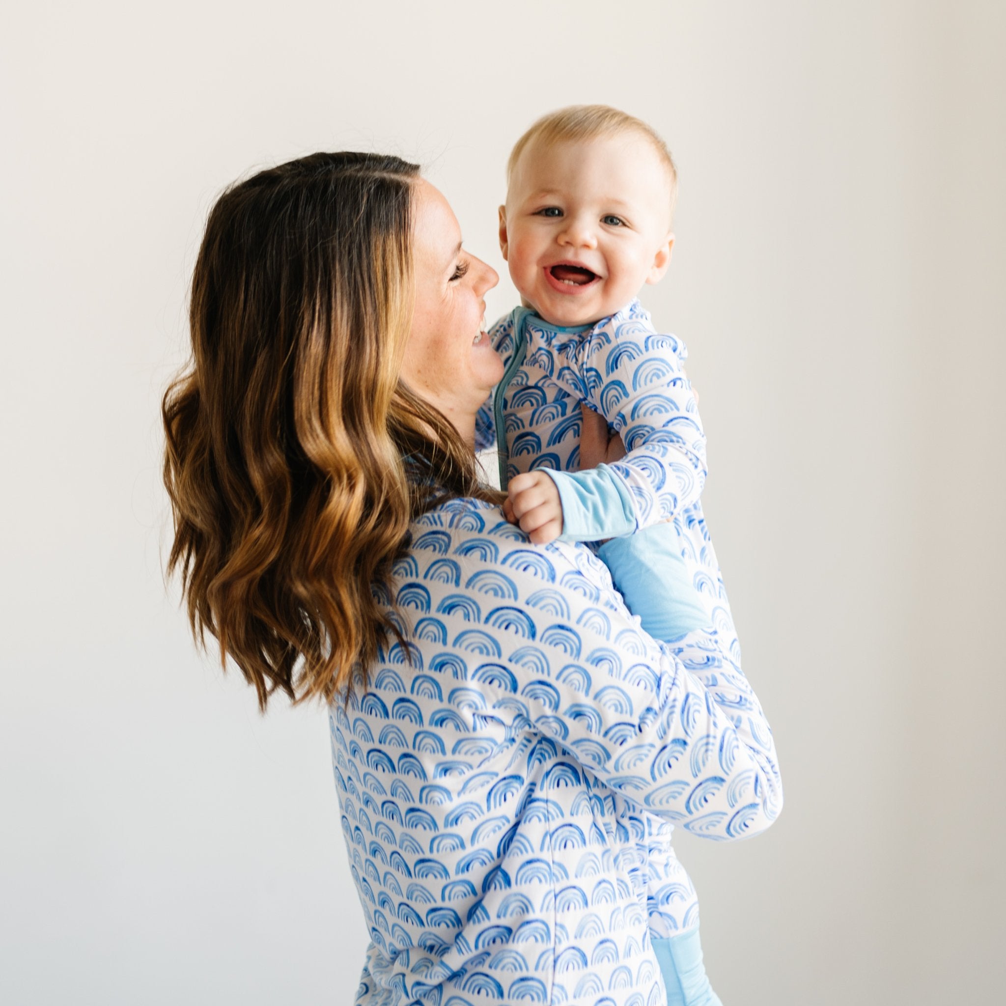 Cuddle up with the kiddos in this dreamy Blue Rainbows print. This PJ Top is made from buttery soft Lunaluxe® Bamboo. The relaxed v-neck makes it extra comfy. with snaps at the neckline for easy nursing access. Pair it with the matching pants to complete the set. then grab styles for your littles!