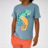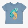 The Chameleon Relaxed Tee is slate blue with a graphic of two chameleons on the front ?? one blue and one orange.