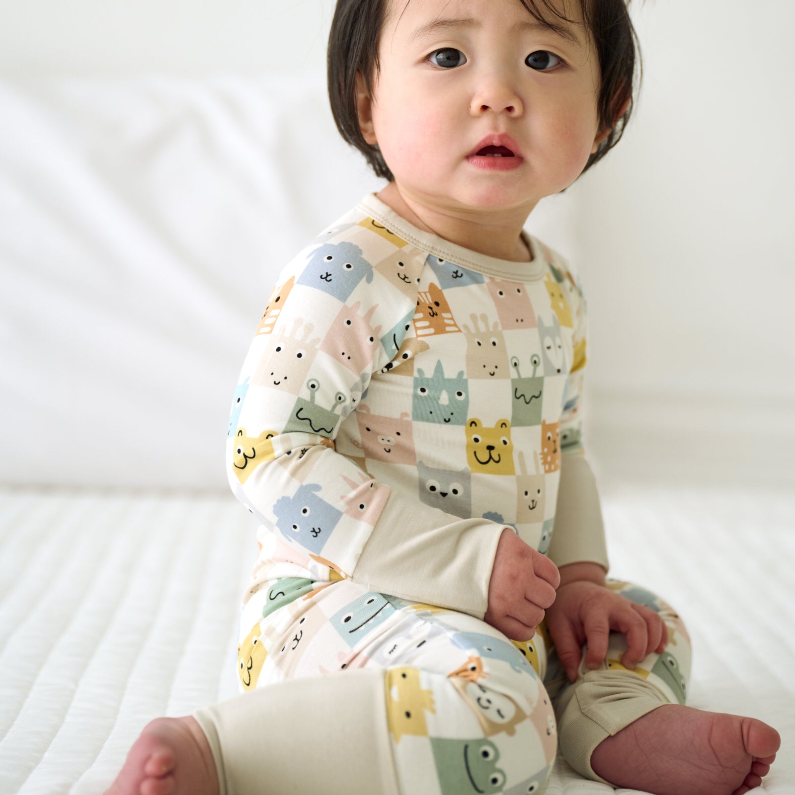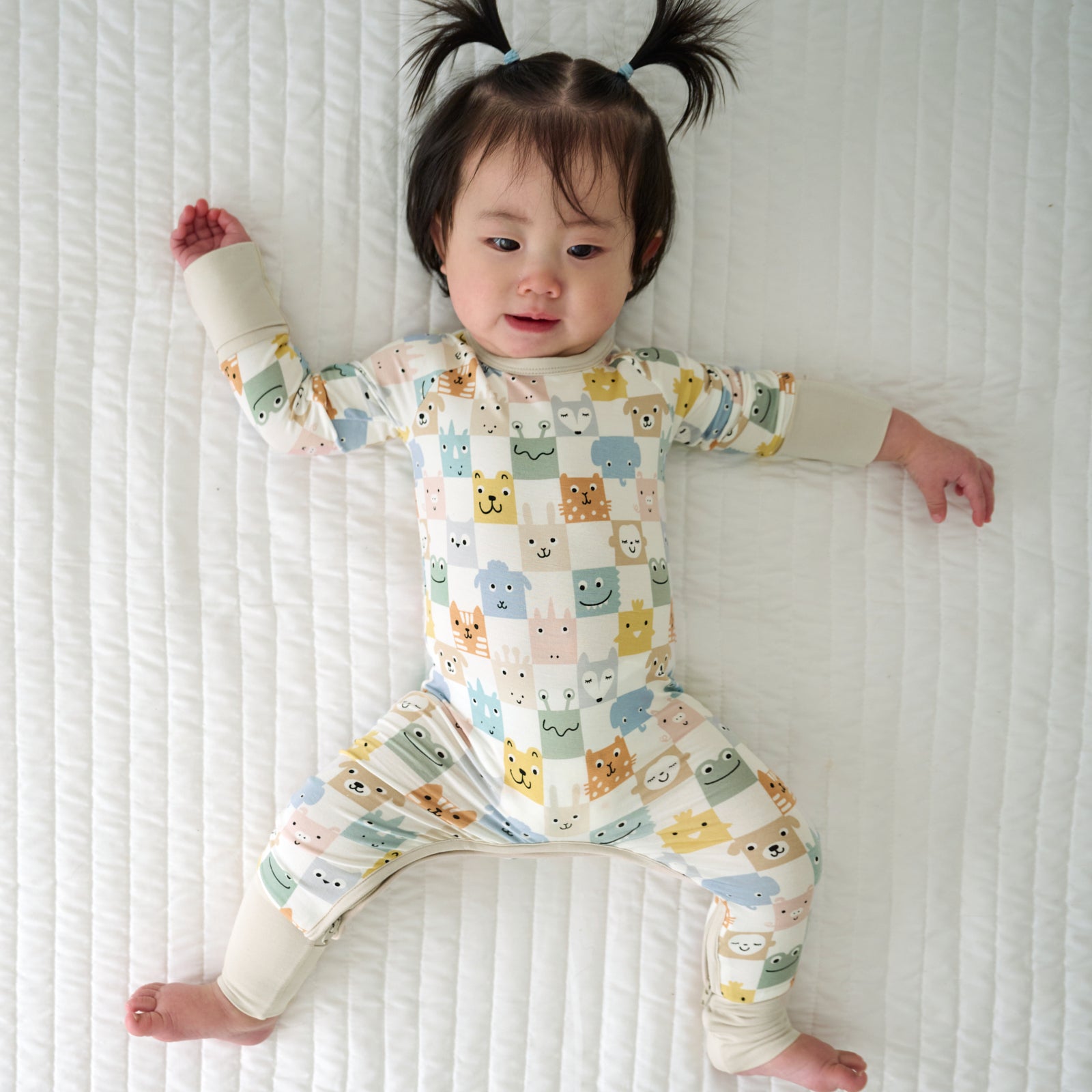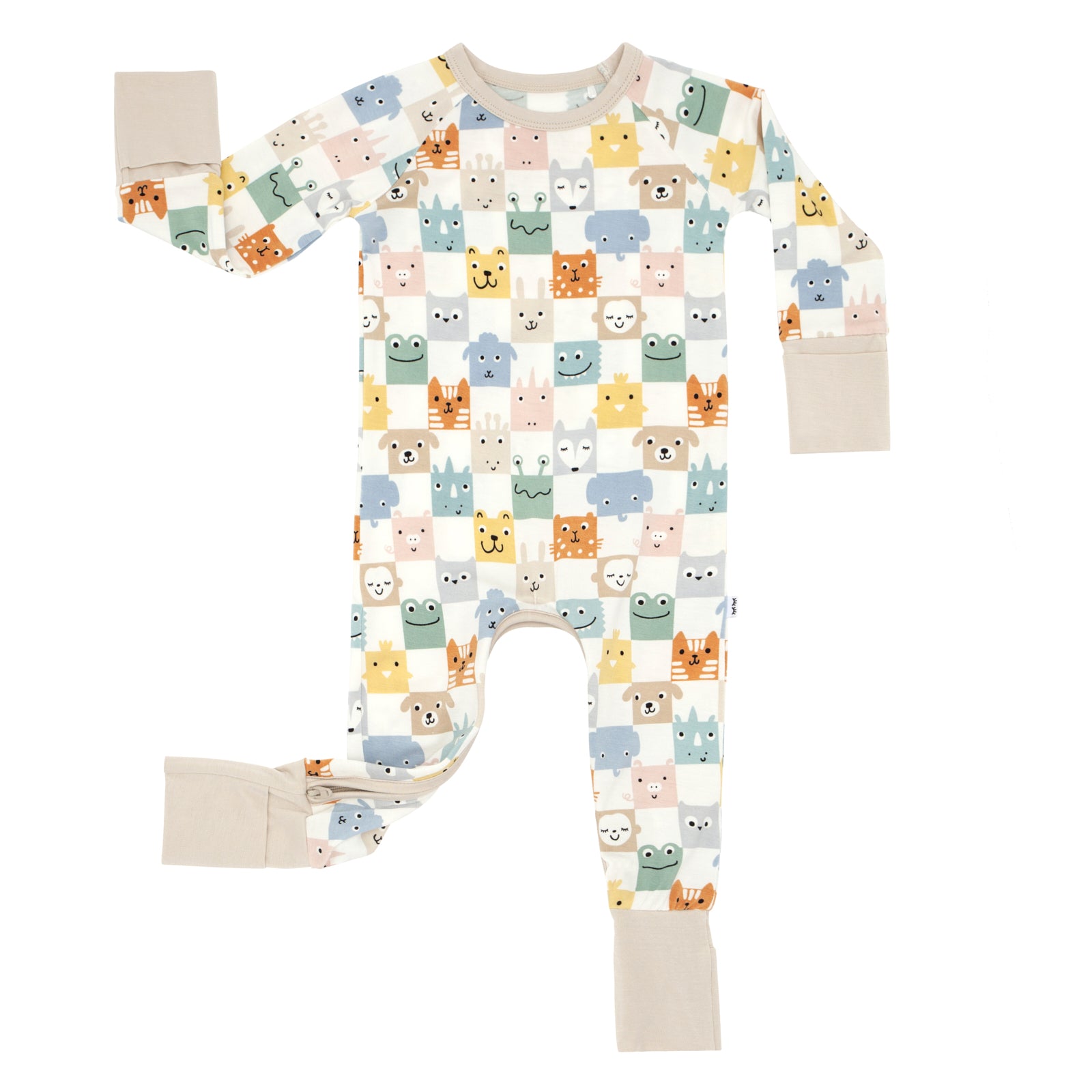 Tuck them in for sweet dreams in this trendy checkerboard zipper pajama. featuring cute animals in muted shades. Made from our signature Lunaluxe® Bamboo with thoughtful features like fold-over feet & mittens. a u-shaped double zipper and no scratchy tags. Don’t forget a matching crib sheet!