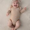 An anytime essential. The Chestnut Brown Stripe Flutter Bodysuit is made from soft. durable bamboo with a snug fit. This adorable newborn bodysuit features lap shoulders for easy dressing and fold-over mittens to protect delicate skin from tiny scratches. The flutter details at shoulders add a photo-worthy touch. while snap closures make diaper changes easy.