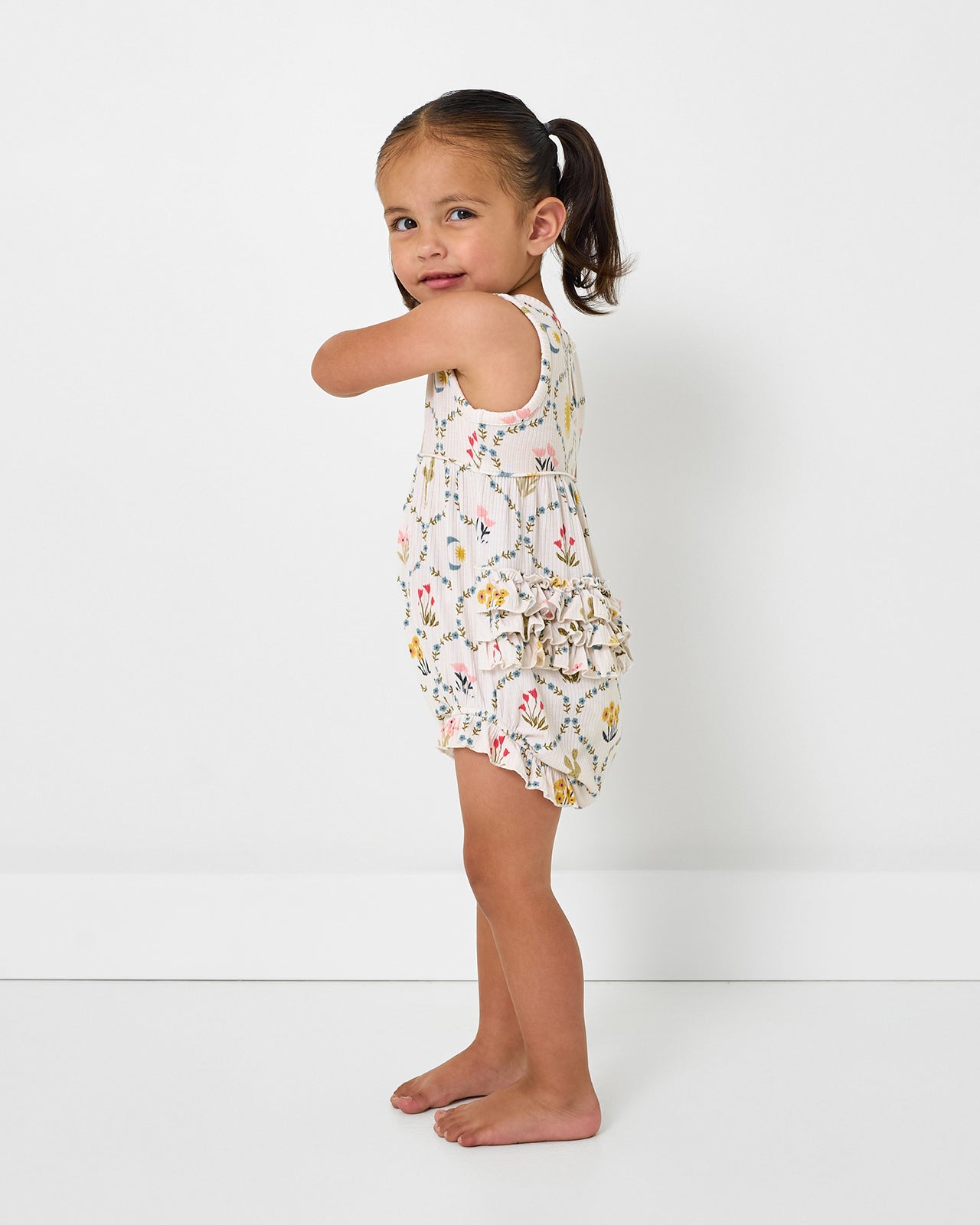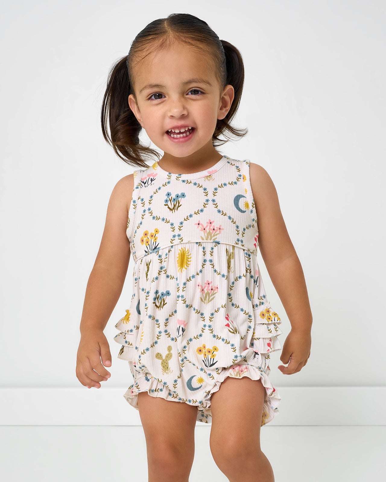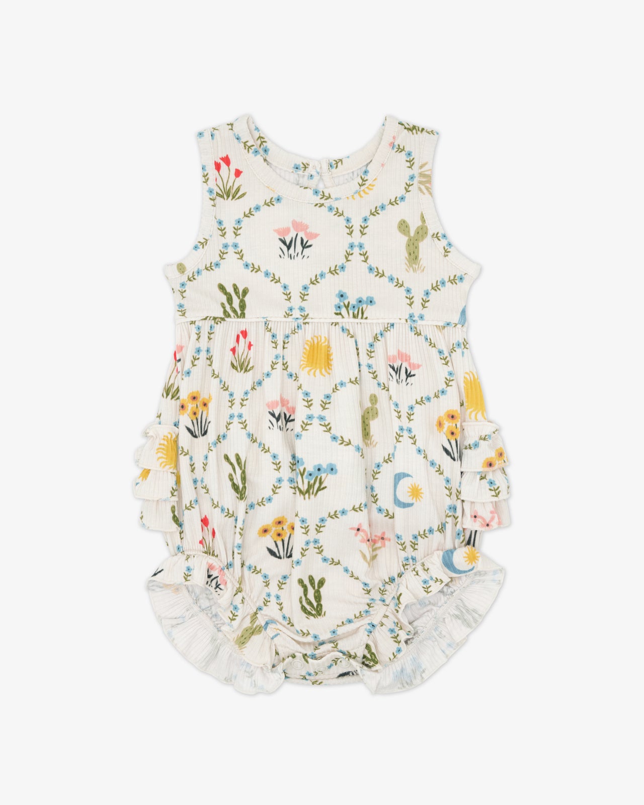 The cutest rustic charm! The Desert Meadow Ribbed Bubble Romper features a trellis pattern with desert florals and cacti your littles will love. Made from durable Soluxe® Bamboo in a soft ribbed fabric. this baby romper has a snappable bottom for easy changes and the sweetest ruffle details. Perfect for sibling matching!