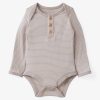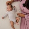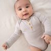 A cozy wardrobe must-have for those precious first few months. The Hazelwood Stripe Henley Bodysuit is made from durable Soluxe® Bamboo jersey with a snug fit and soothing touch. This adorable newborn bodysuit features lap shoulders for easy dressing and fold-over mittens to protect delicate skin from tiny scratches. Plus. snap closures make diaper changes a breeze. Comes in a bamboo keepsake bag that can double as a gift bag. We love it paired with the Dove Gray Fold-Over Legging!
