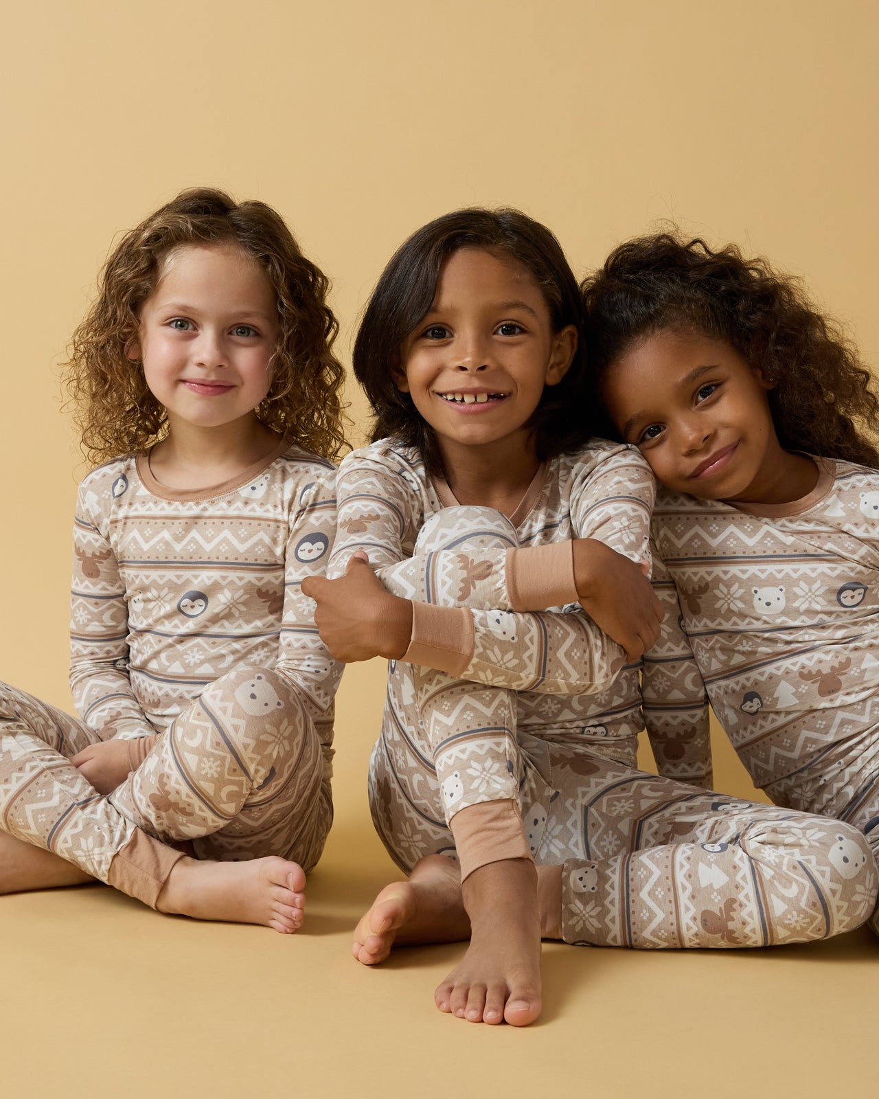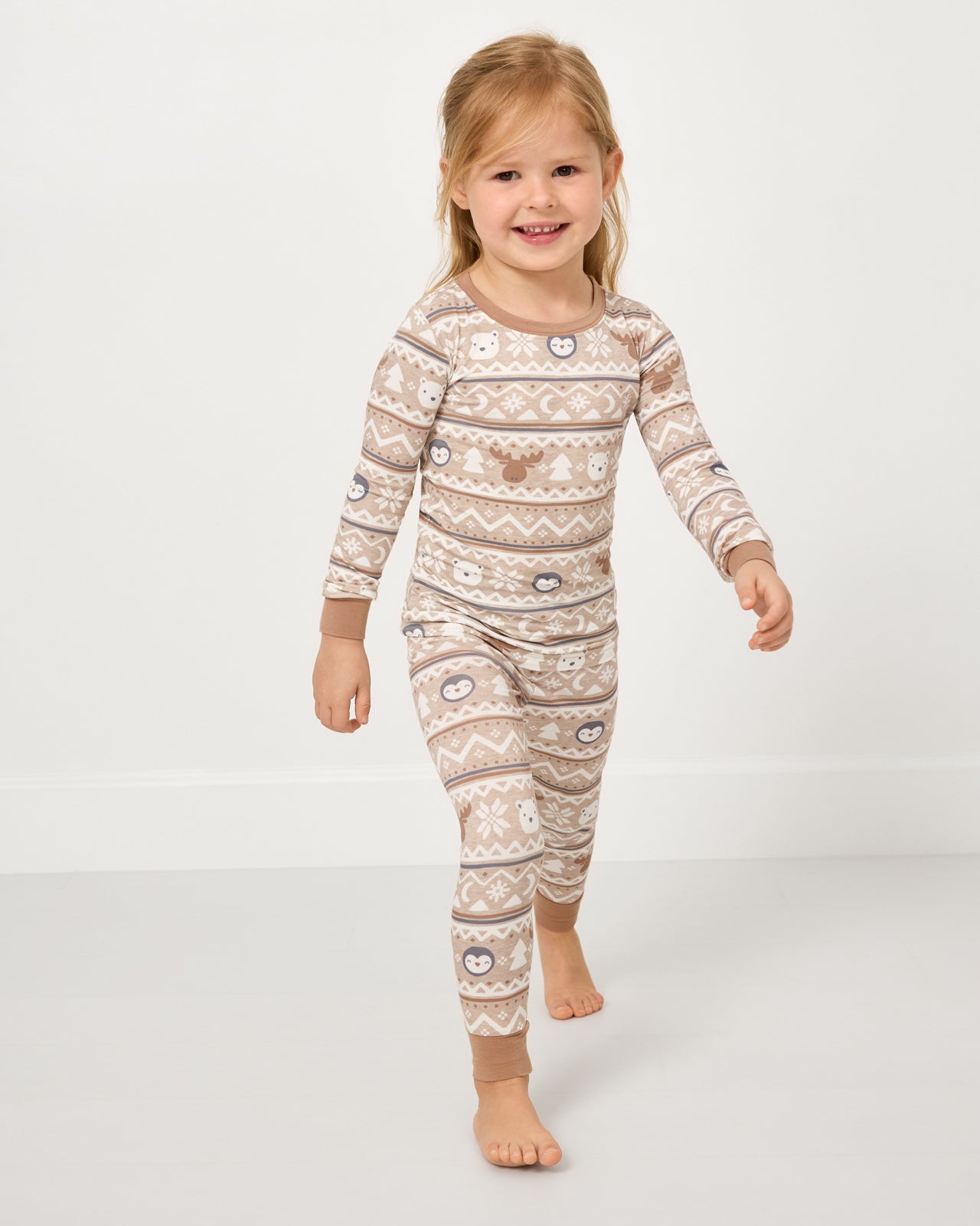 The perfect pajamas for snuggle season! The Frosty Fair Isle Two-Piece Pajama Set features moose. polar bears. and sleepy-eyed penguins in neutral tones. Made from soft Lunaluxe® Bamboo. these bamboo kids pajamas feature long sleeves and matching pants with extra length to fit up to 3x longer. Grab matching styles for the coziest family cuddles!