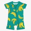 The Go Bananas print features yellow bananas scattered across a teal green print. The trim is matching teal green.