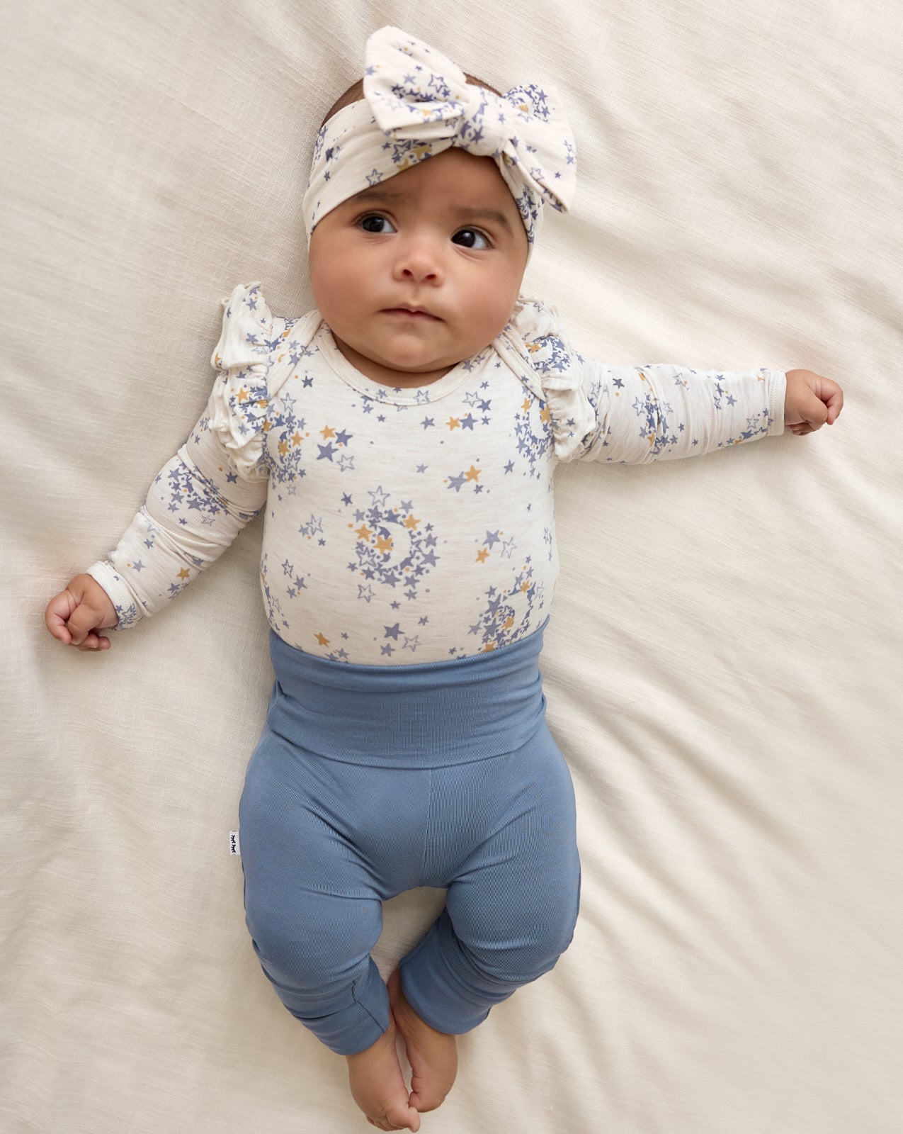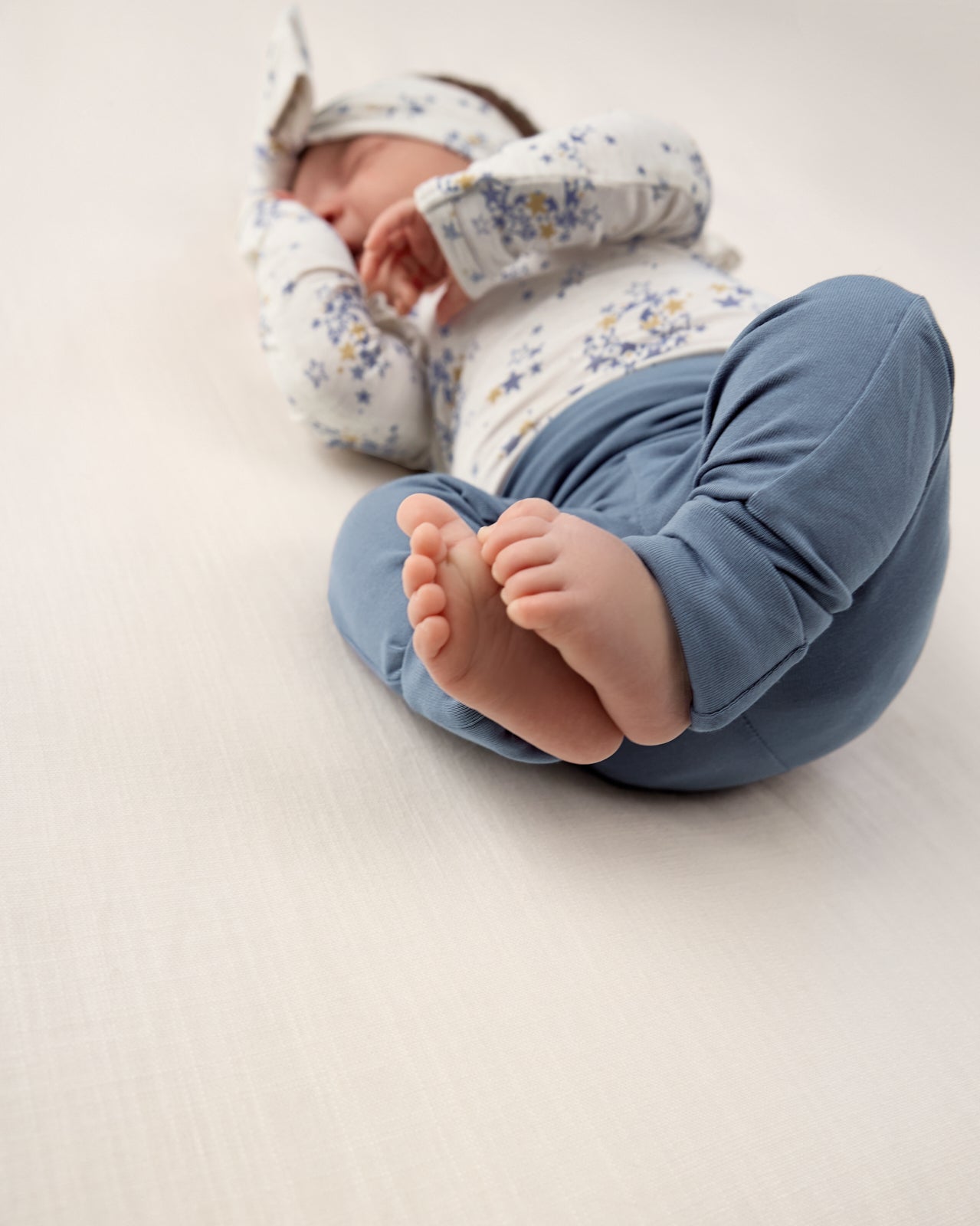 A comfy essential for those precious early days. Our Hazy Blue Fold-Over Leggings are made with durable bamboo. complete with an adjustable fold-over waistband that’s perfect for healing belly buttons. The fold-over foot cuffs keep tiny toes warm. while the tagless design protects even the most sensitive skin. Layer them with the matching Henley Bodysuit!
