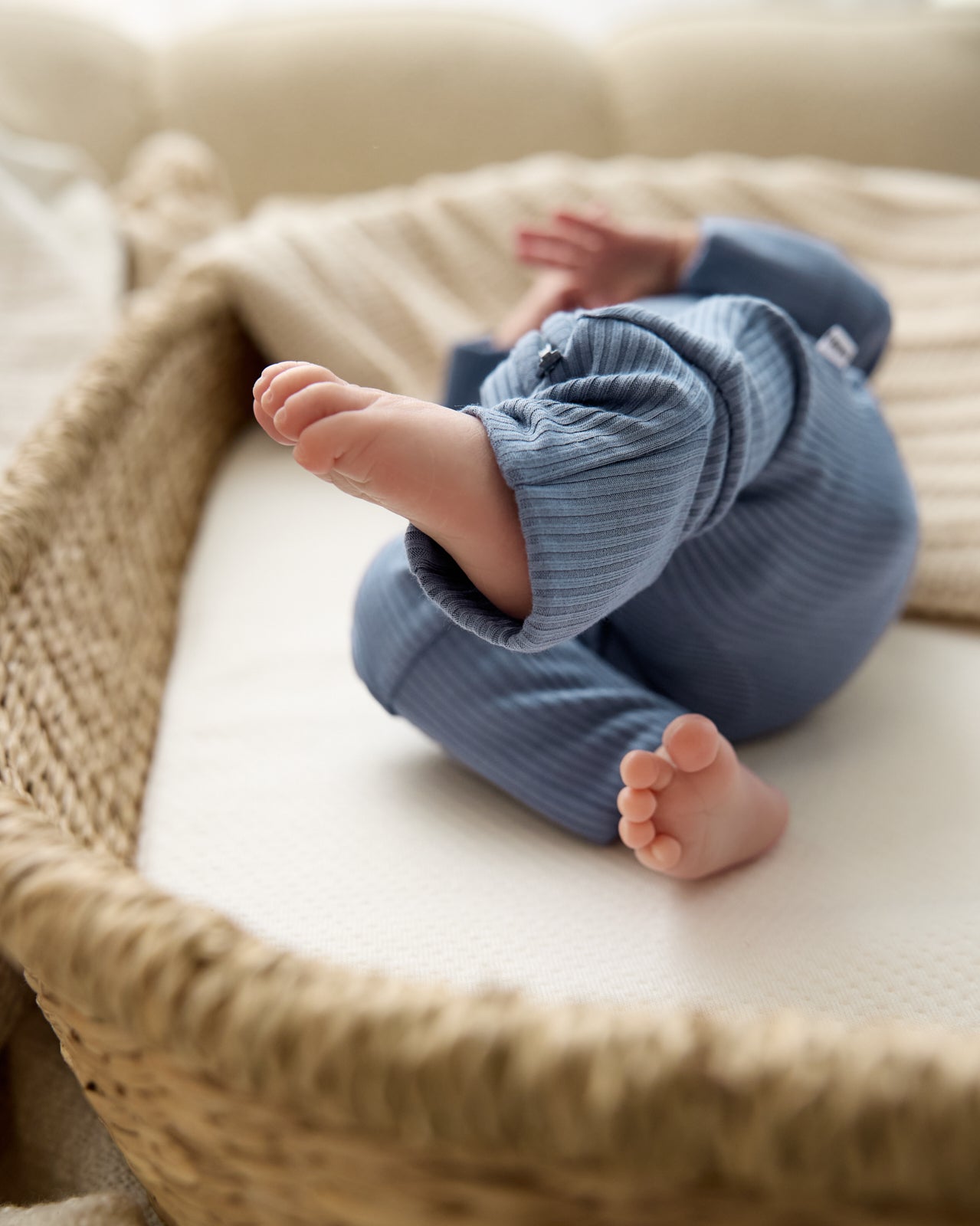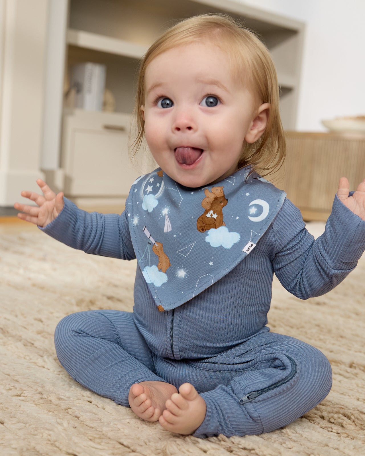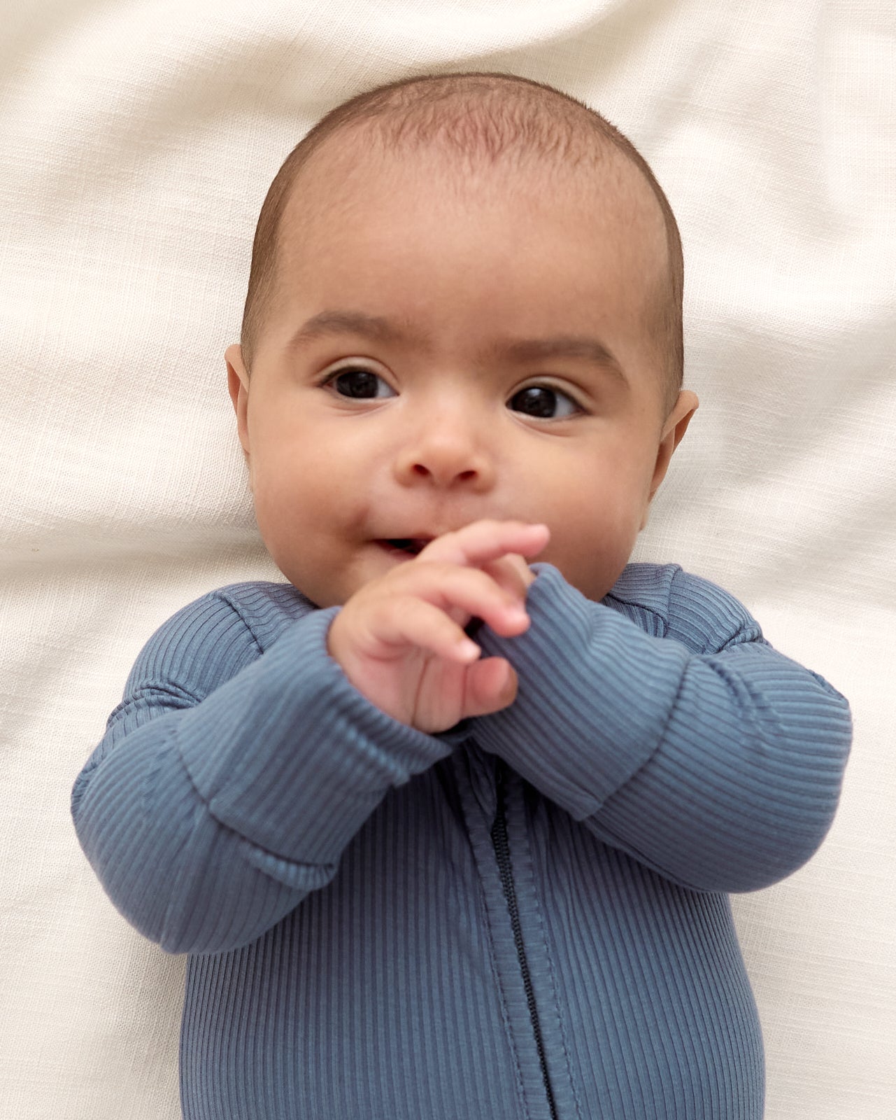 Add a little more comfort to those first winter memories. Made from soft ribbed bamboo. this Hazy Blue Ribbed Zippy is so gentle on baby’s delicate skin. It boasts mama-designed details you’ll love. like fold-over mittens to protect tiny cheeks. convertible feet that adapt as they grow. and a double zipper to make middle-of-the-night changes a little easier. The fabric is a fan-fave for a reason!