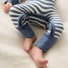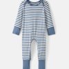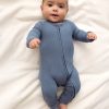Welcome baby in comfort. The Hazy Blue Stripe Crescent Zippy is made with ultra soft bamboo that’s gentle on delicate skin. Featuring fold-over mittens for scratch-free sleep and convertible foot cuffs to keep toes warm. The U-shaped double zipper makes diaper changes quick. while lap shoulders ensure easy dressing. Tagless and seamless. these adorable bamboo baby pajamas grow with littles.