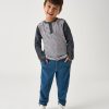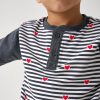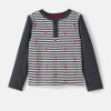 Hey. little heartbreaker! The Heartstrings Stripe Henley Tee features charming stripes with red micro hearts on soft and durable Soluxe® Bamboo. This boys t shirt has a henley neckline with functional buttons and a relaxed fit perfect for playtime. Mix & match with their fave LS bottoms!