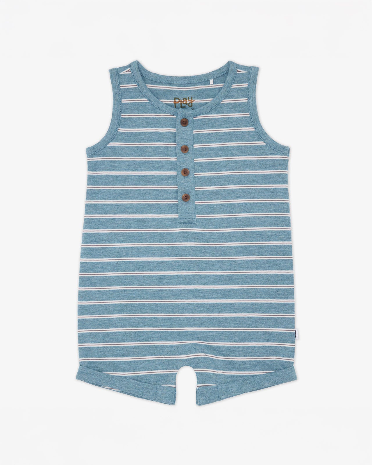Breezy and built for adventure! The Heather Dusk Blue Stripes Tank Button Romper is made from durable Soluxe® Bamboo for a soft feel that’s gentle on sensitive skin. With functional buttons. ring snaps for quick changes. and cute rolled-cuff legs. this relaxed-fit romper is a go-to for sunny day Play.