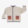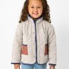 The Linen Heather Quilted Barn Jacket is light heather beige. The trim is faded navy blue and the pockets are caramel.