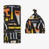 The Little Builders print is filled with colorful tools ?? such as drills. pliers. wrenches. and more ?? neatly arranged across a black background.