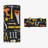 The Little Builders print is filled with colorful tools ?? such as drills. pliers. wrenches. and more ?? neatly arranged across a black background.