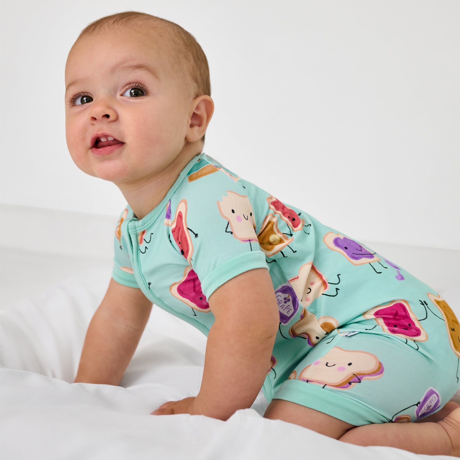 The sweetest jammies and sammies! This bamboo baby sleeper is here to spread smiles. Made from buttery soft Lunaluxe® Bamboo. our Lunch Buddies Shorty Zippy is always gentle on sensitive skin. With a convenient double zipper and short style perfect for warmer weather. it’s love at first bite. Grab matching styles for the whole fam!