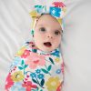 Welcome. little wildflower! The Midsummer Meadow Swaddle & Luxe Bow Headband Set features the prettiest Scandi-inspired floral on stretchy Lunaluxe® Bamboo. This layette set includes a versatile baby swaddle blanket and adjustable bow headband that never needs tying. Packaged in our signature peekaboo gift box. it’s the perfect baby shower present!