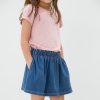The best of both worlds! Our Denim Skort in Midwash Blue is a twirl-worthy skirt with comfy attached jersey shorts. This skort has the look of denim but the softness of our Soluxe® Bamboo! Made for Play. it features an easy pull-on fit. ruched waist. and decorative drawstring. Plus. side pockets for tiny treasures! Perfect for twirling. tumbling. and all-day fun. Pair it with a coordinating top to make playtime skort-tacular!