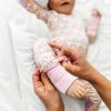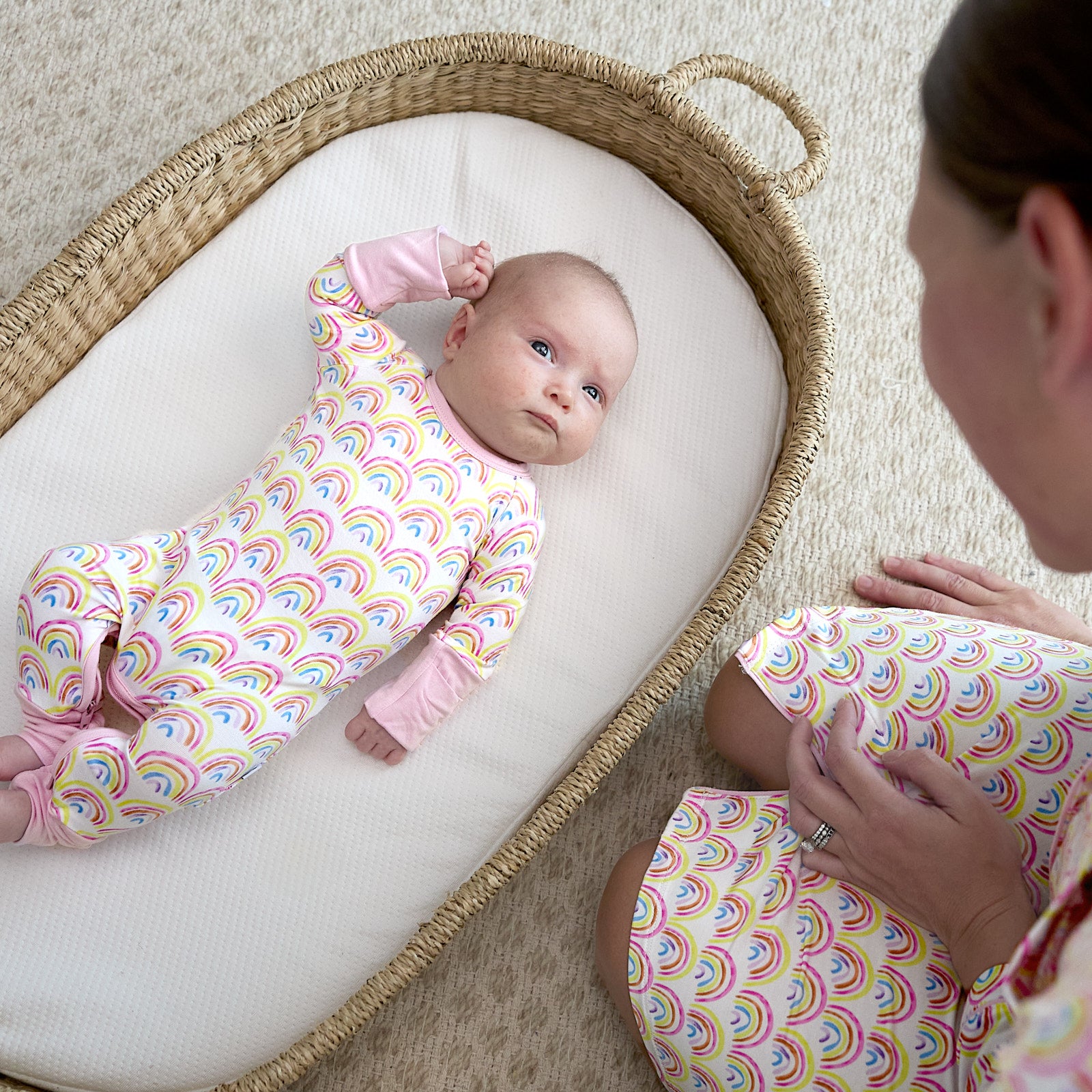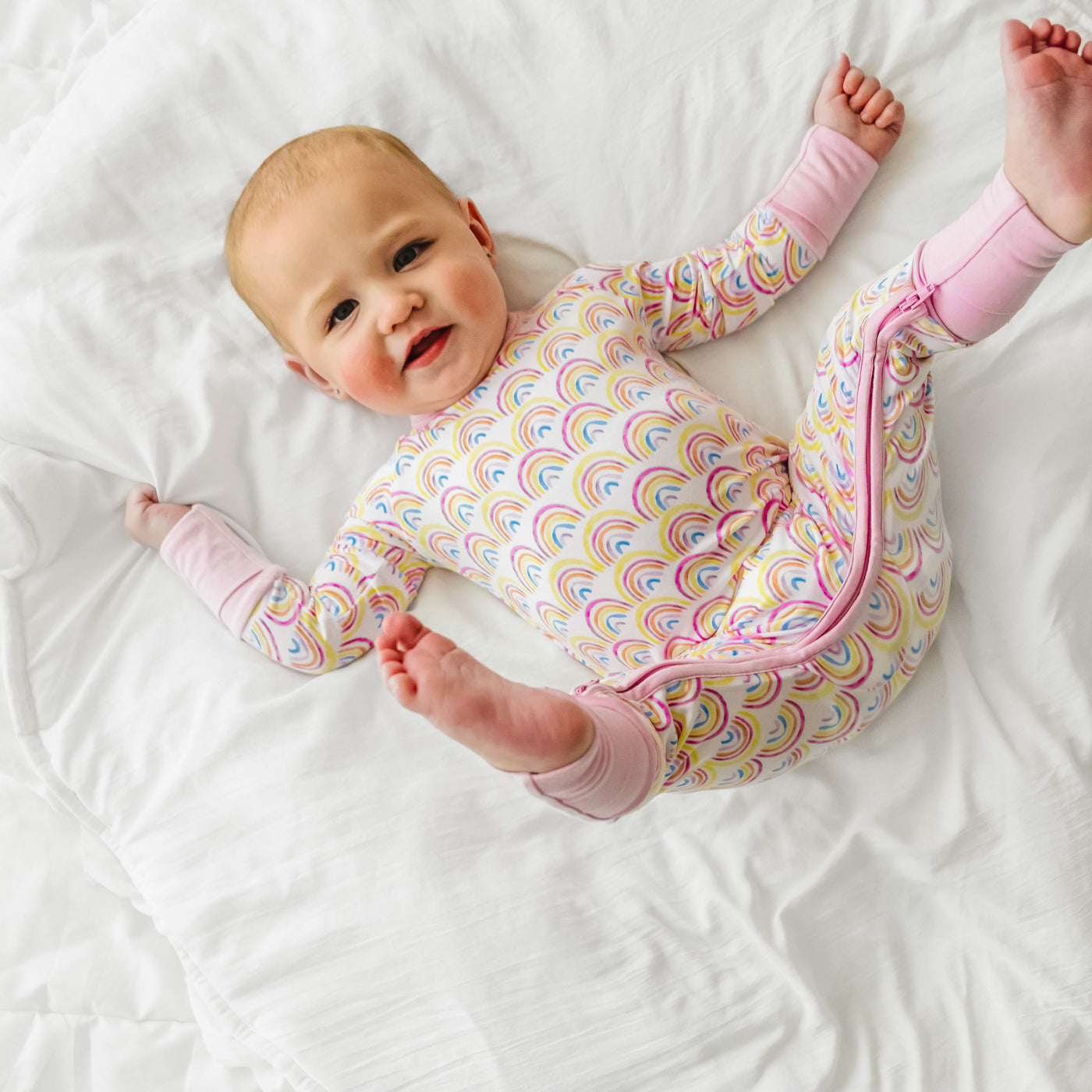 Sweet dreams are just over the rainbow in this Crescent Zippy! Featuring pastel rainbows on a white background with a light pink trim. it will be an instant fave in your PJ rotation. Made from our signature Lunaluxe® Bamboo. with thoughtful features like fold-over feet & mittens. a u-shaped double zipper. and no scratchy tags. Don’t forget a Luxe Bow for the perfect finishing touch!