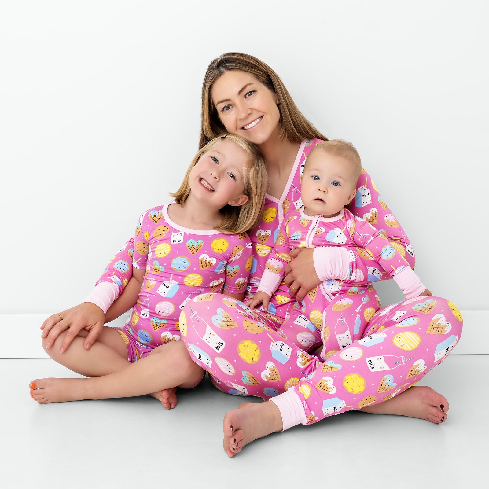 A print as sweet as your little one’s smile! This charming one-piece zipper pajama features sleepy and smiley cookies & milk on a light pink background. Made from our signature Lunaluxe? Bamboo. with thoughtful features like fold-over feet & mittens. a 2-way zipper. and no scratchy tags. Snag styles for full family matching!