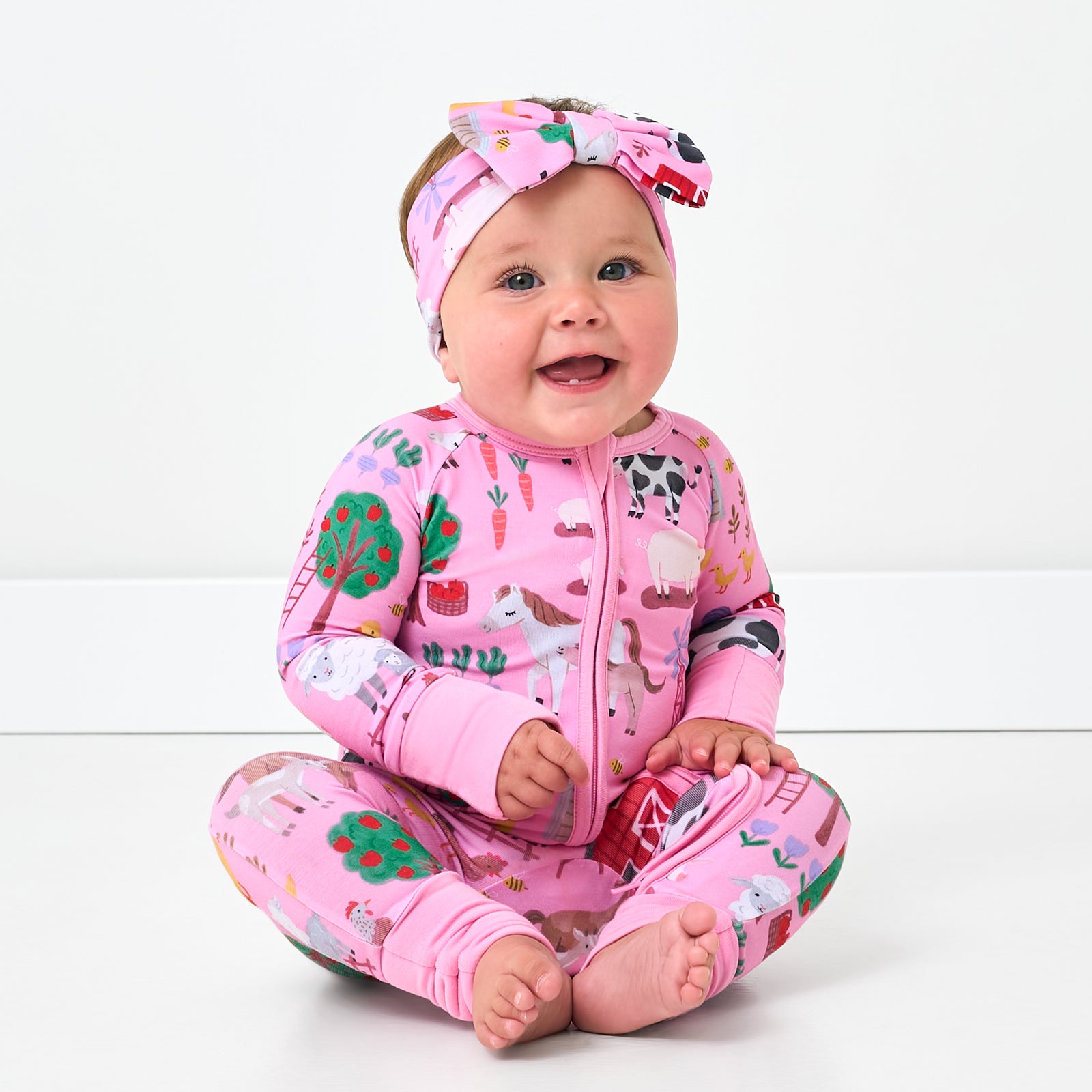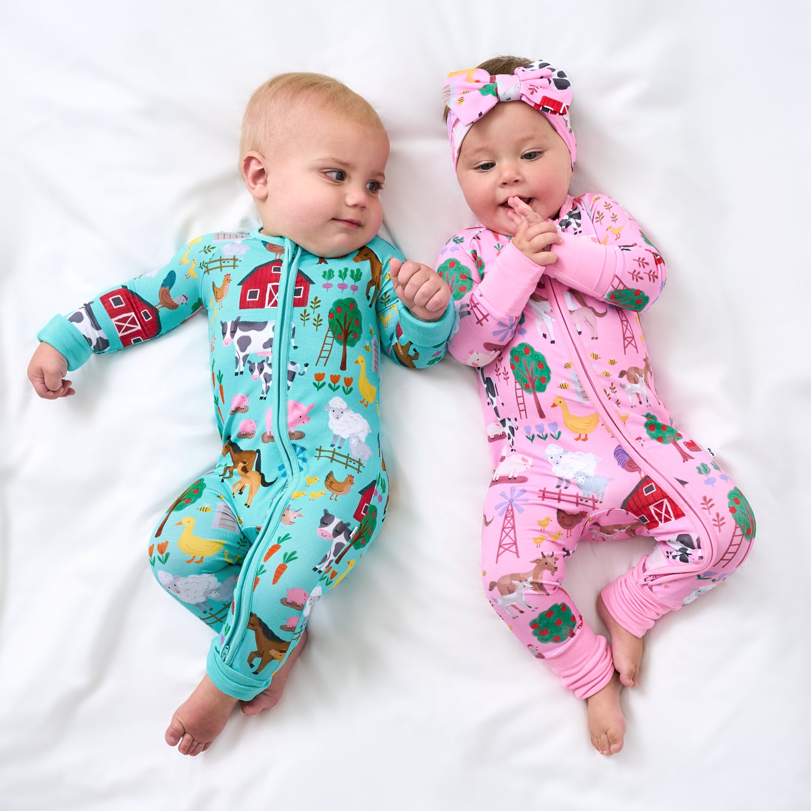 Rise and shine. little farmer! These bamboo baby pajamas showcase the cutest barnyard friends on a sweet pink backdrop. Made from buttery soft Lunaluxe® Bamboo. the Farm Fam Zippy is gentle on sensitive skin and designed for year-round comfort. With fold-over mittens. foot cuffs to keep tiny toes warm. and a double zipper for easy changes. it’s as convenient as it is cute. Snag both colorways for sibling matching!