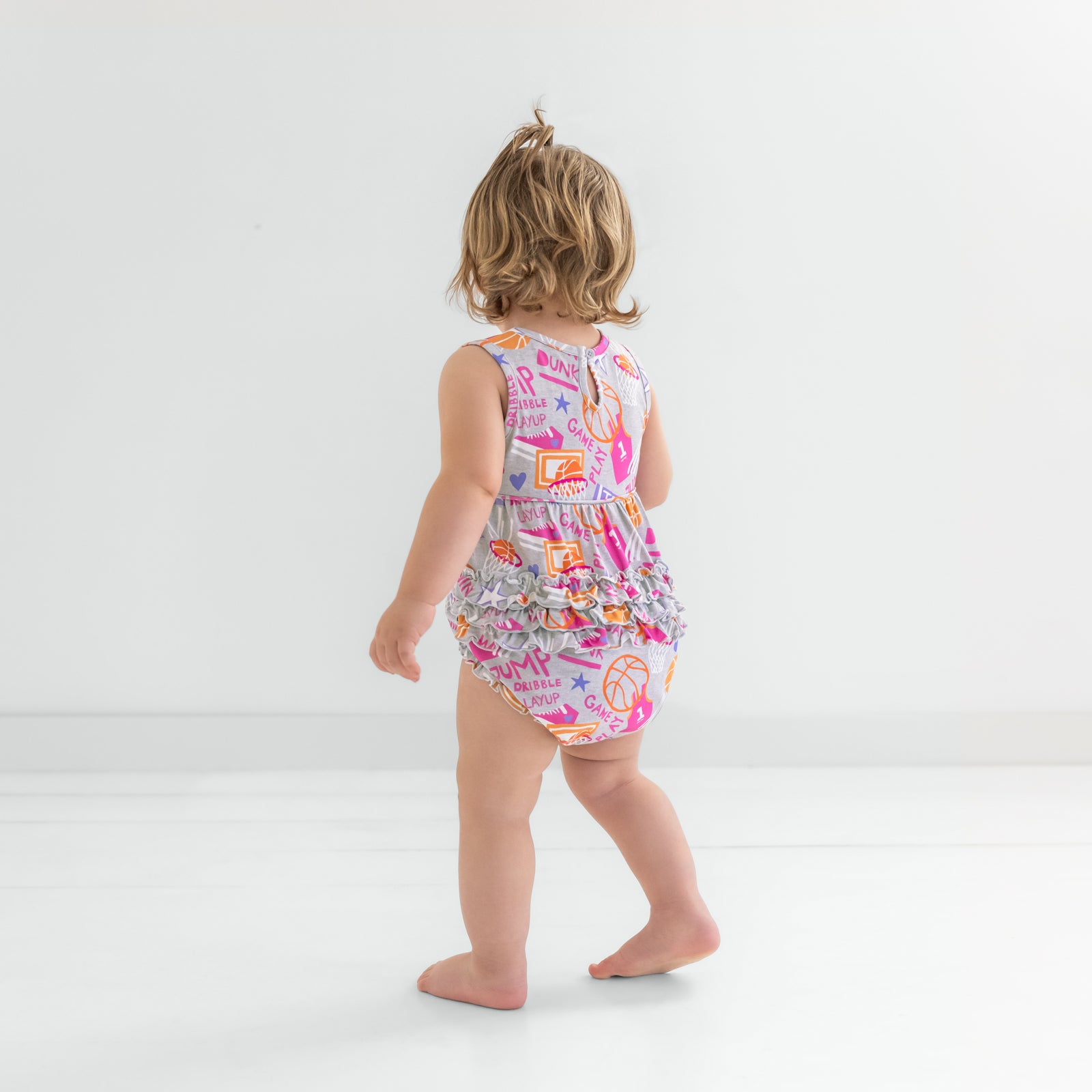 Dainty details meet sporty vibes with our Slam Dunk Bubble Romper! This playful romper features basketball graphics in shades of pink and orange. with adorable ruffles across the bottom. Crafted from soft and durable Soluxe? Bamboo. it’s gentle on sensitive skin and made for all-day comfort. Snap closures make diaper changes a breeze. while elastic leg openings ensure a snug. comfy fit. A sporty-sweet pick for your mini MVP!