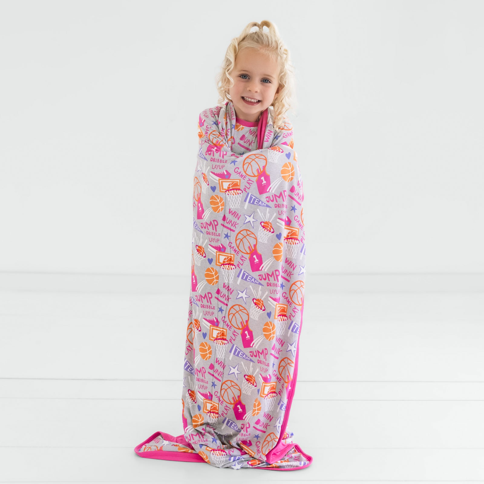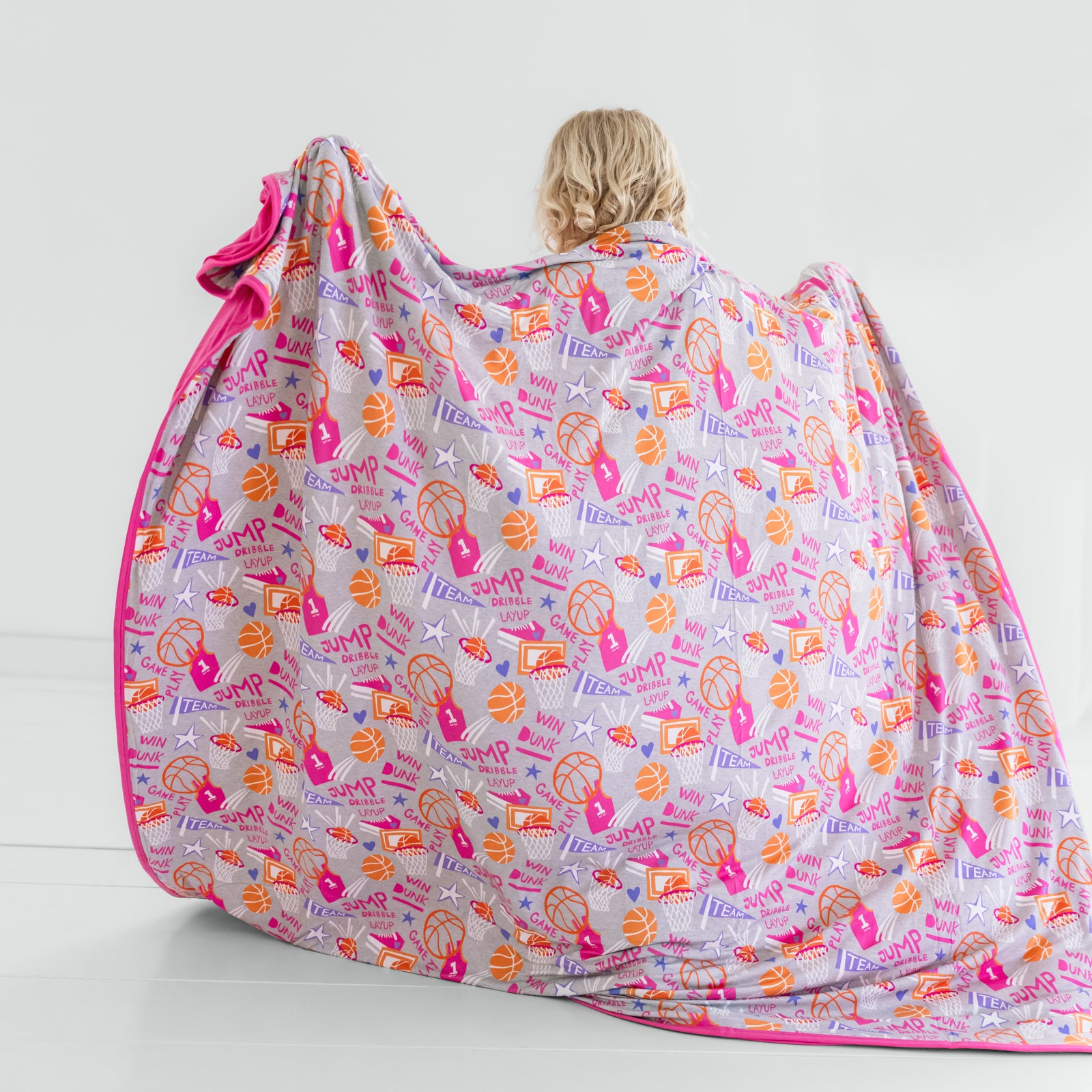 Score big on comfort with our Slam Dunk Cloud Blanket! Featuring adorable basketball graphics in pink and orange and coordinating pink on the other side. this triple-layered Lunaluxe® Bamboo blanket is buttery soft and gentle on sensitive skin. With its generous size and sporty design. it’s a winning pick for snuggling up with the fam on game days!
