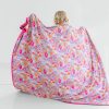 The Pink Slam Dunk print features a heather gray background with basketballs. jerseys. pennants. shoes. and basketball hoops. Stars and phrases such as win. dunk. dribble. and more are scattered throughout in pink. The trim and backing are a vibrant pink.