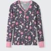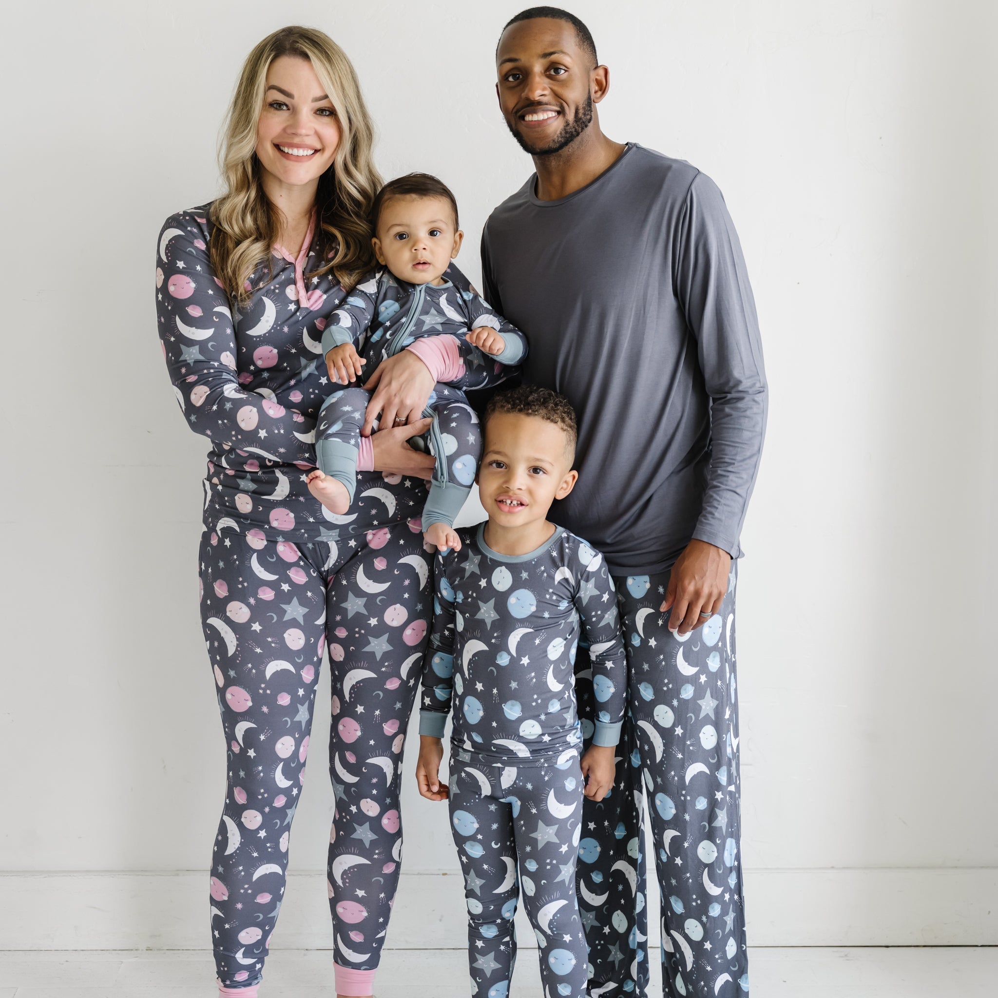 Dream up a galaxy of fun with your kiddos! Featuring pink moons. stars and planets in deep gray skies. this PJ Top is made from buttery soft Lunaluxe® Bamboo. The relaxed v-neck makes it extra comfy. with snaps at the neckline for easy nursing access. Pair it with the matching pants to complete the set. then grab matching styles for the whole family!