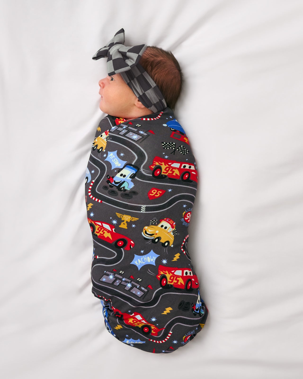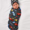 Welcome to the winner’s circle. little racer! This Disney & Pixar Cars layette set showcases Pixar’s Lightning McQueen and friends. Made from buttery soft Lunaluxe® Bamboo. the Piston Cup Swaddle & Luxe Bow Headband Set is oh-so soft on newborn skin. The versatile swaddle comes with a coordinating bow headband that never needs tying! Packaged in our signature peekaboo gift box. it’s ready to race straight to any new parent’s heart.