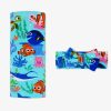 The Disney’s Nemo’s Reef print features Disney’s Nemo. Dory. Crush. and more fan-fave characters swimming through colorful coral on an aqua blue background.