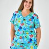 The Disney’s Nemo’s Reef print features Disney’s Nemo. Dory. Crush. and more fan-fave characters swimming through colorful coral on an aqua blue background. The trim is a deeper hue of aqua blue.