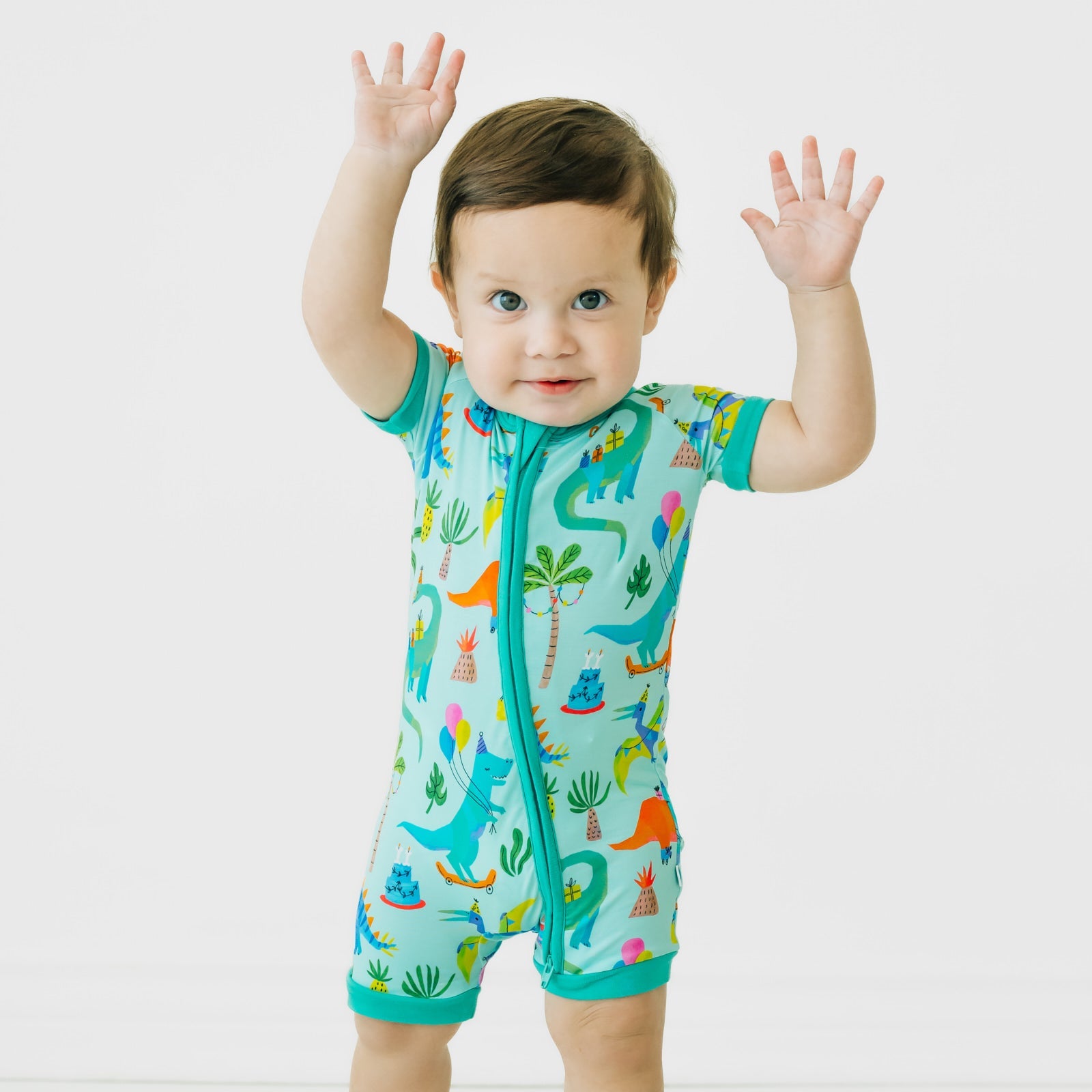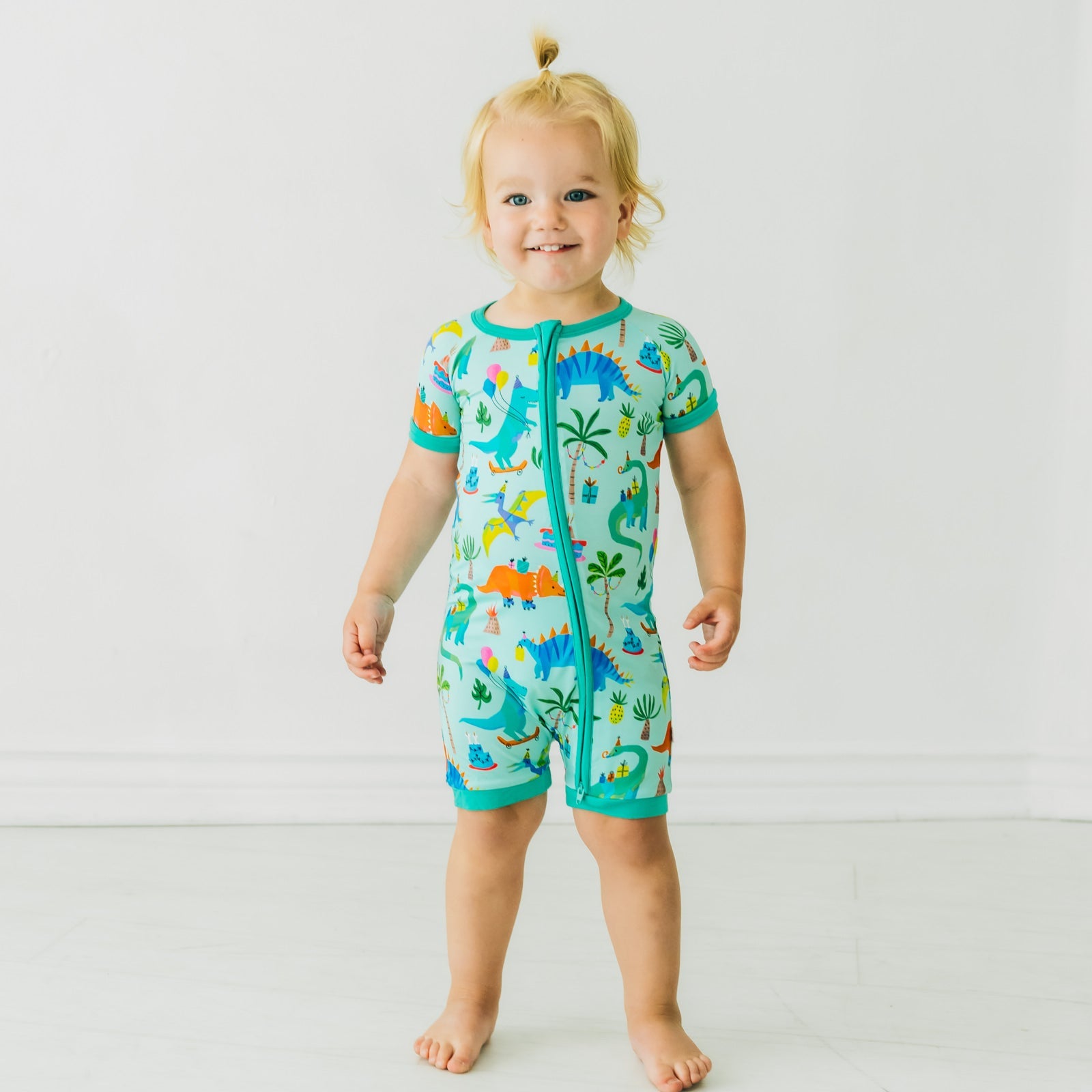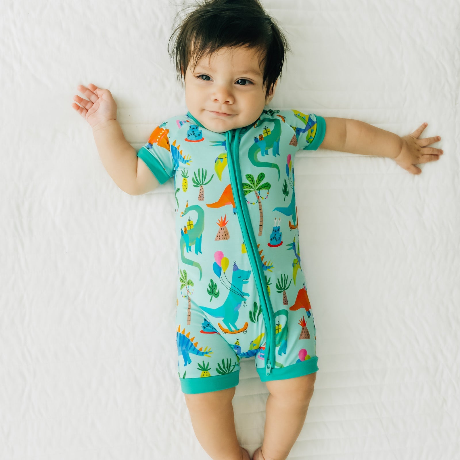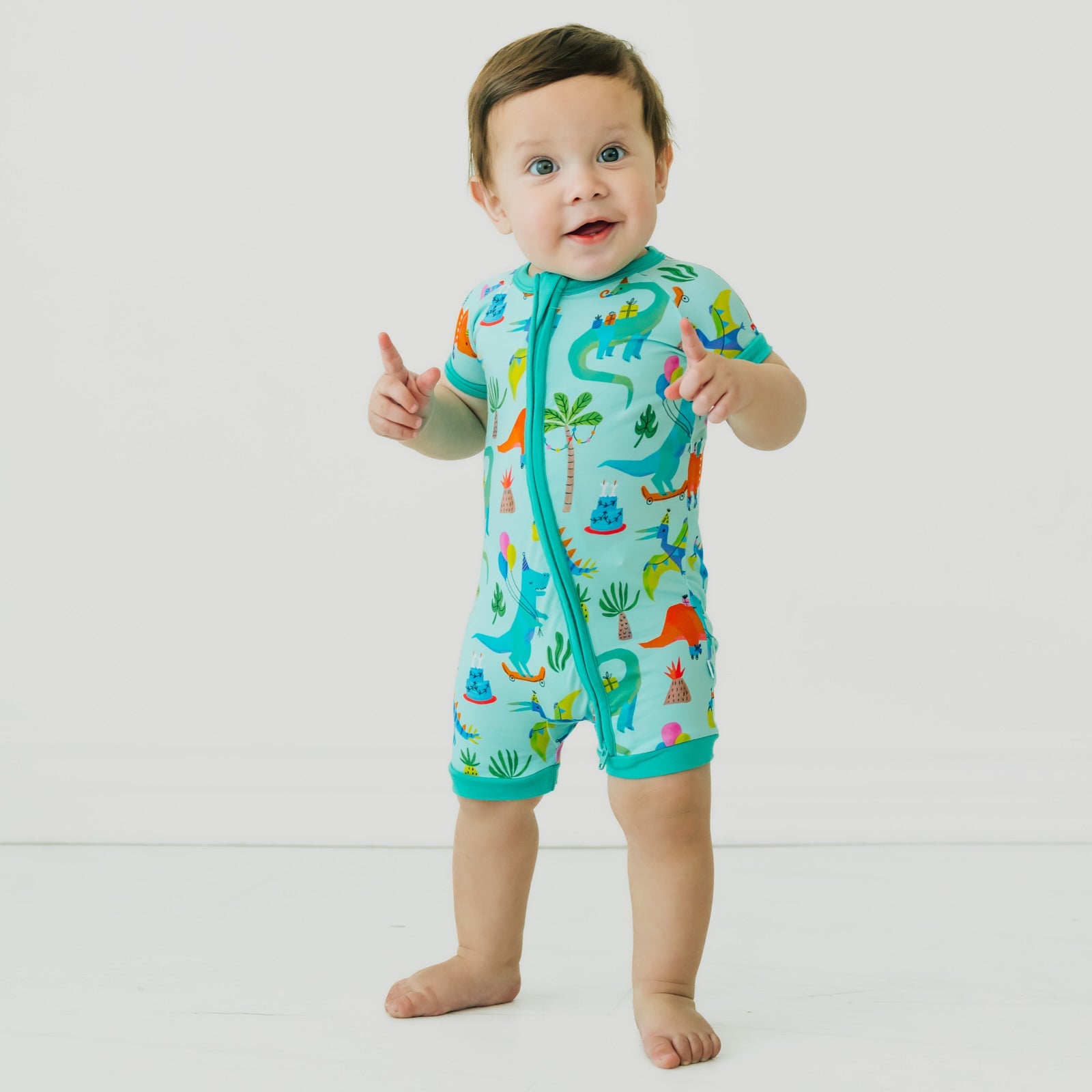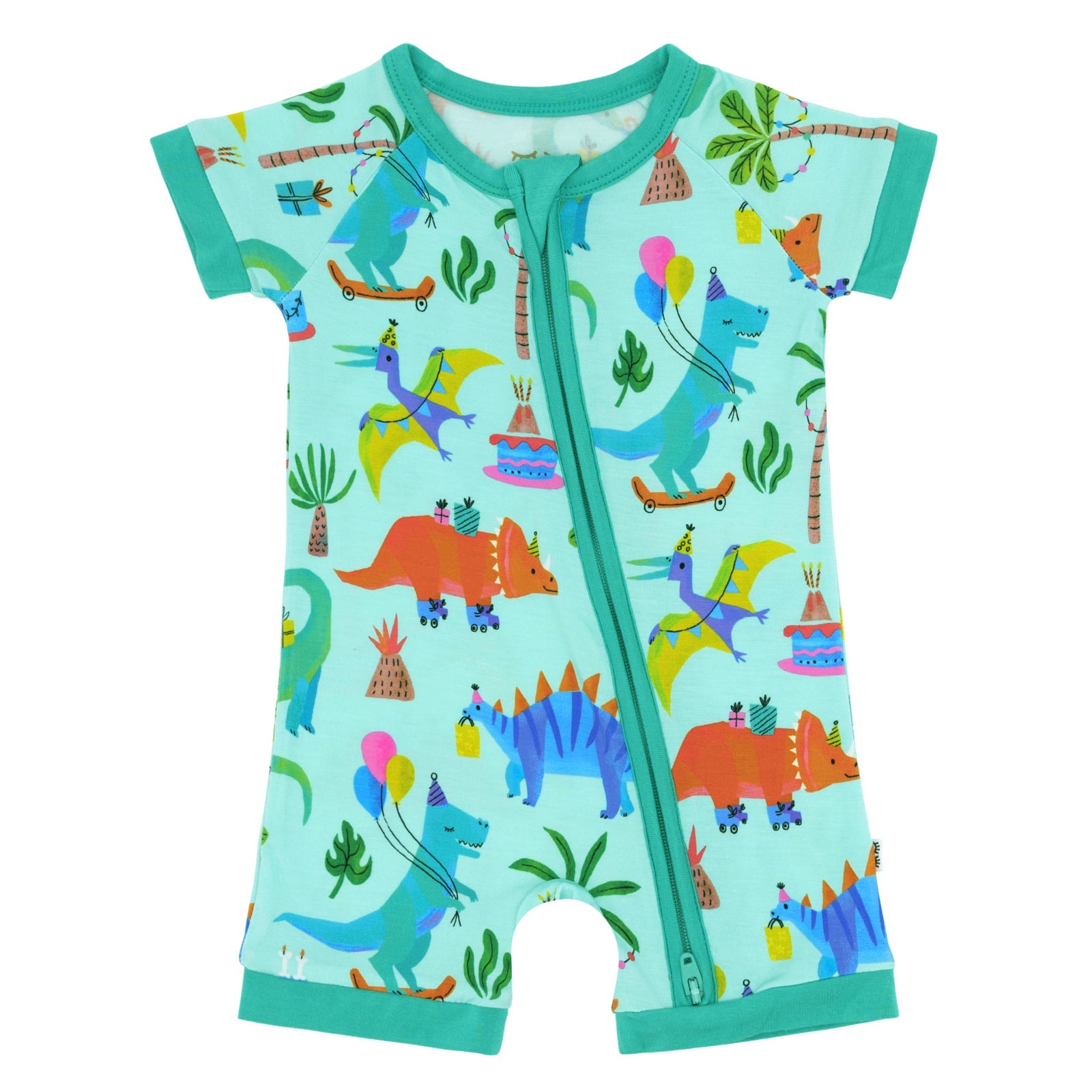 It’s party time! This one-piece zipper pajama features cute dinosaurs ready to celebrate. surrounded by decor. cakes & more. Made from our signature Lunaluxe? Bamboo. with thoughtful features like a double-zipper that extends down the leg & no scratchy tags. Just the perfect birthday outfit ?? or birthday gift!
