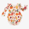 Dress your little harvest helper! The Pumpkin Pals Bubble Romper features sweet-faced pumpkins and friends for fall. Made from durable Soluxe® Bamboo. this baby romper has a snappable bottom for easy changes and the sweetest ruffle details. Perfect for pumpkin patch photo ops and family matching!