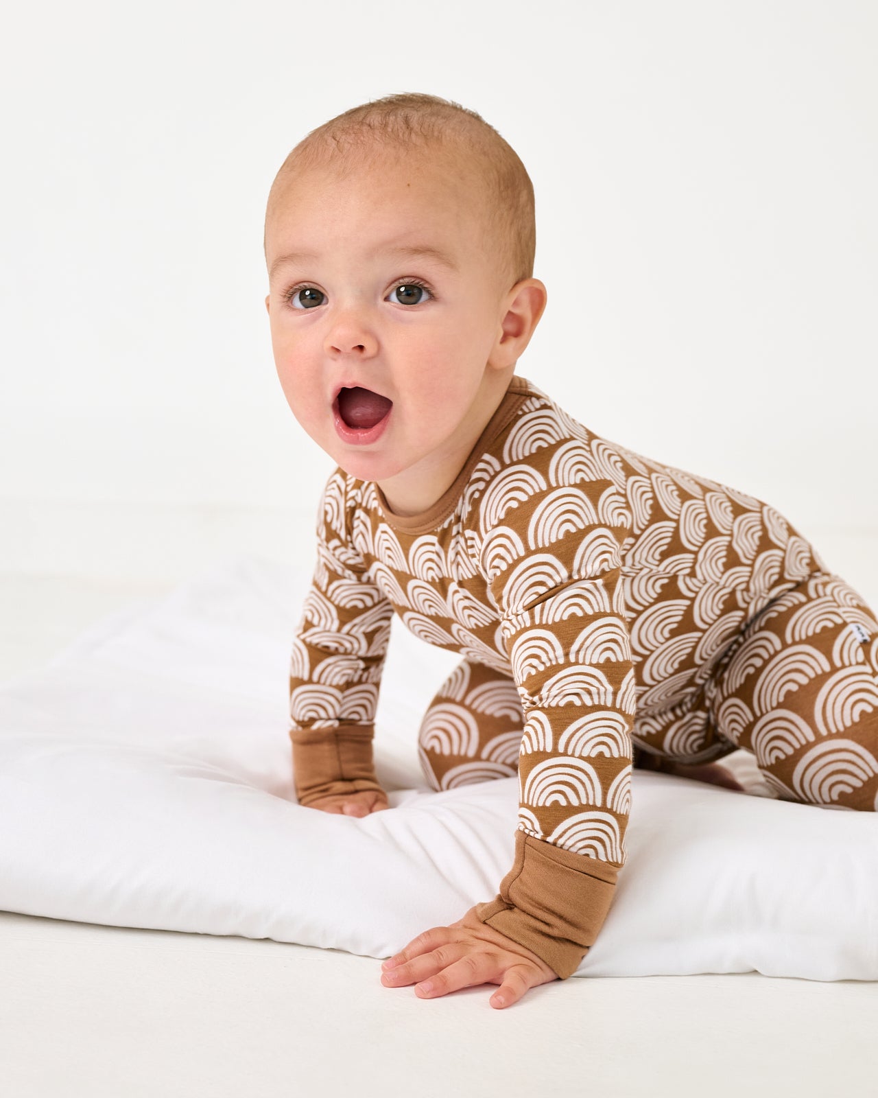 Calling all little dreamers! Featuring white rainbows on a neutral background. Rust Rainbows is a fan-favorite. Made from our signature Lunaluxe® Bamboo. with thoughtful features like fold-over feet & mittens. a u-shaped double zipper. and no scratchy tags. Don’t forget a Luxe Bow for the perfect finishing touch!