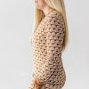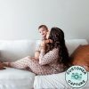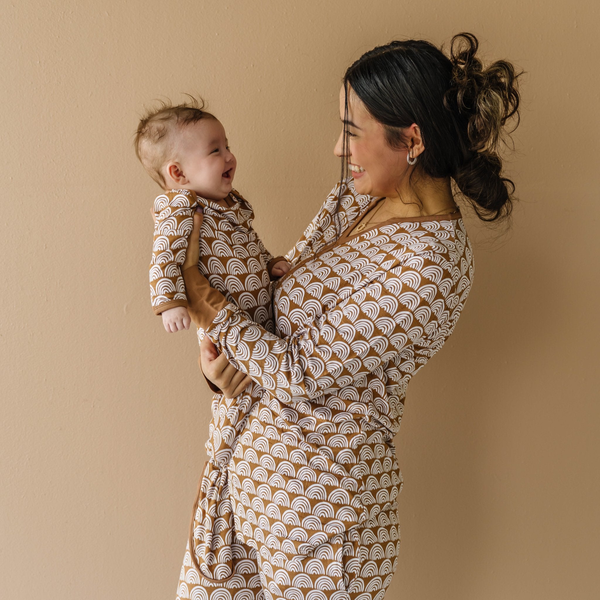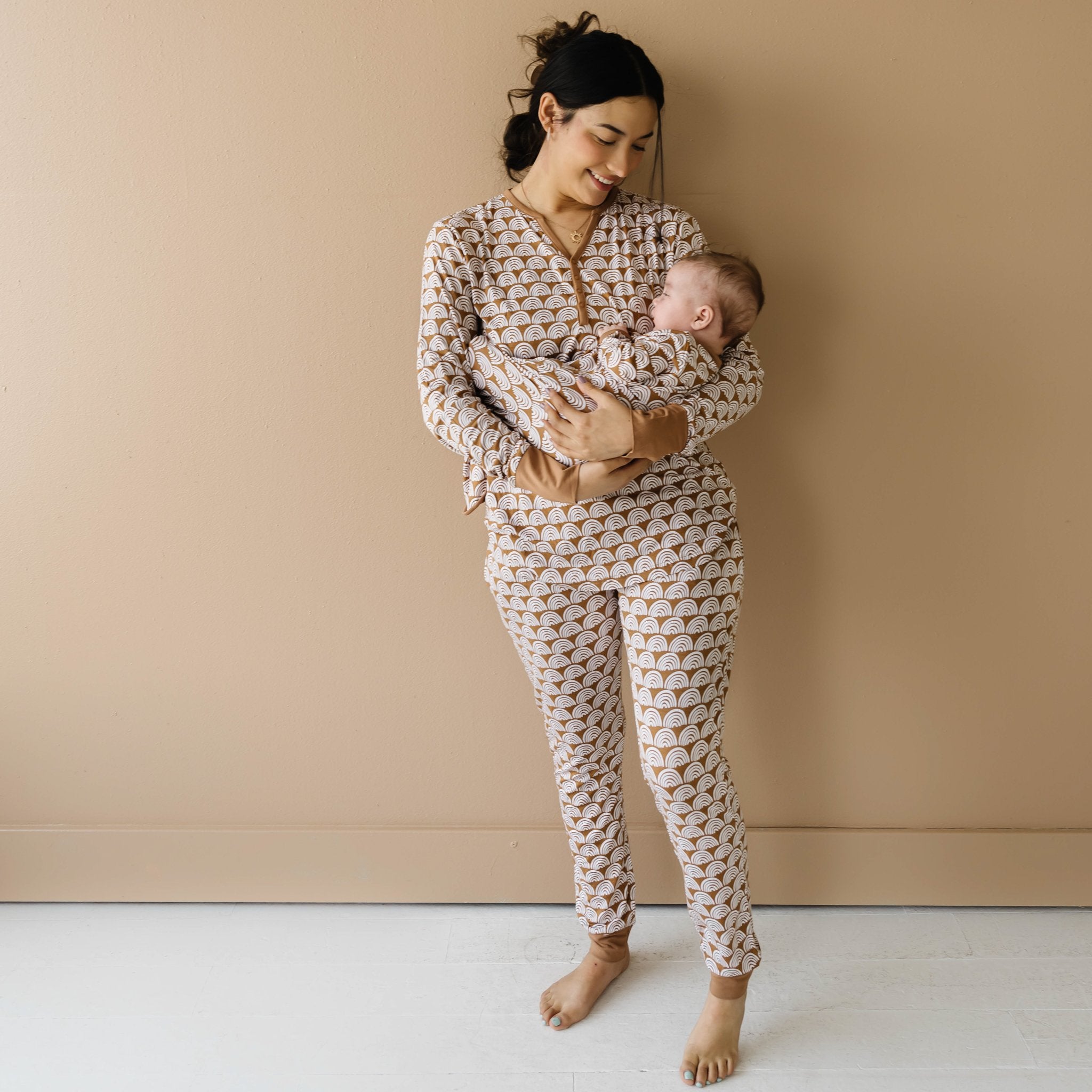 Just the perfect everyday PJ Top! Featuring white rainbows on a neutral background. Rust Rainbows is a fan-favorite. Crafted from our custom-milled Lunaluxe® Bamboo. complete with front snaps for nursing ease. Pair it with the matching pants to complete the set. then grab styles for family matching!