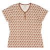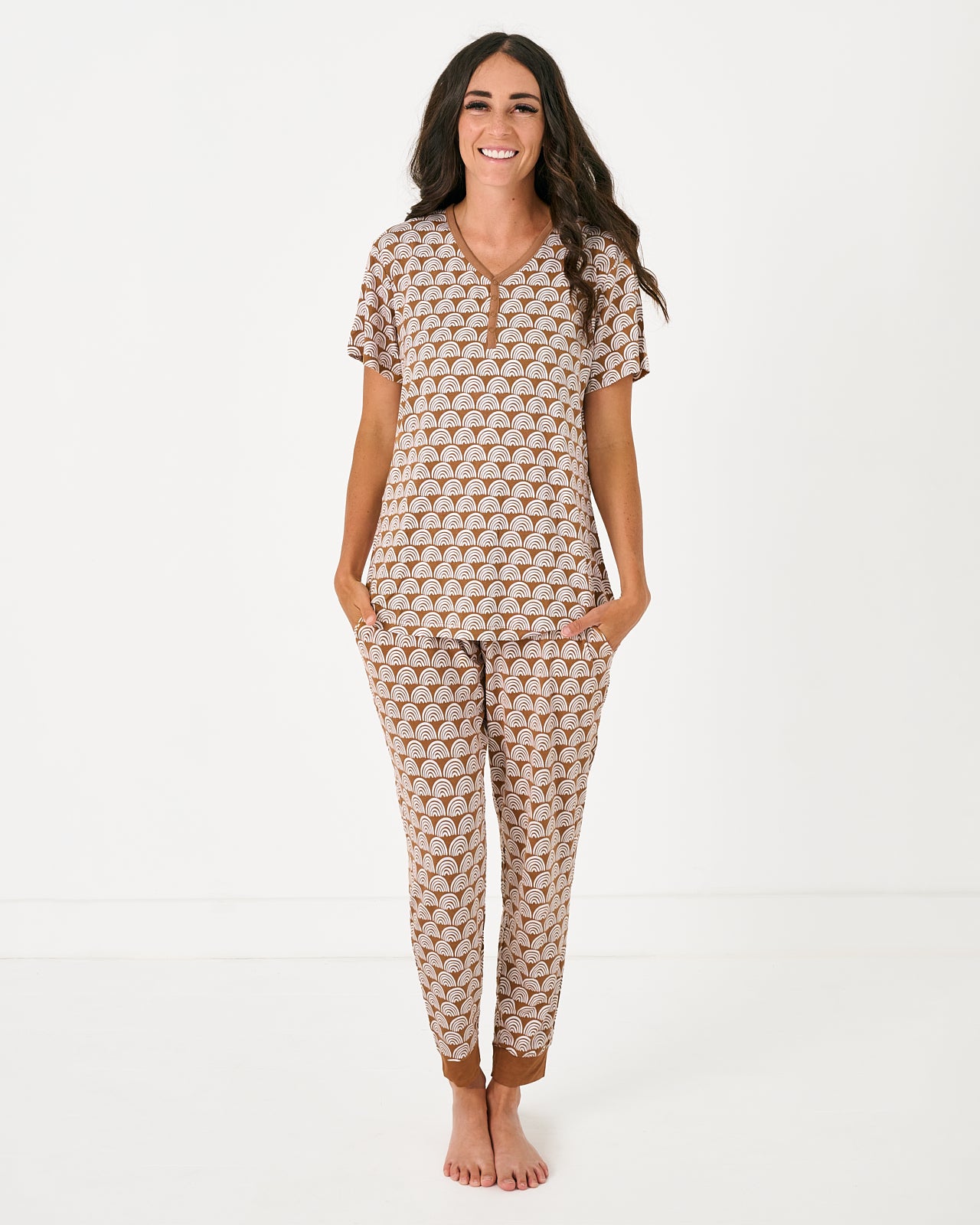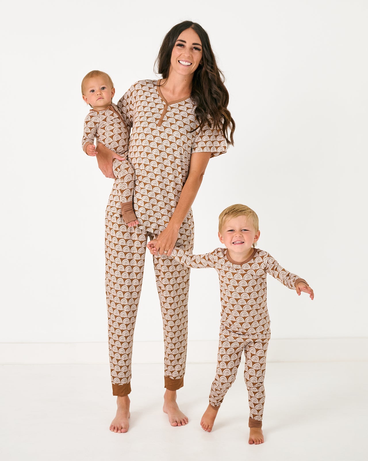 Just the perfect everyday PJ Top! Featuring white rainbows on a neutral background. Rust Rainbows is a fan-favorite print. Made from custom-milled Lunaluxe? Bamboo and complete with front snaps for nursing ease. in a short sleeve style that’s perfect for warmer weather. Pair it with the matching shorts. then grab styles for your little ones. too!