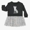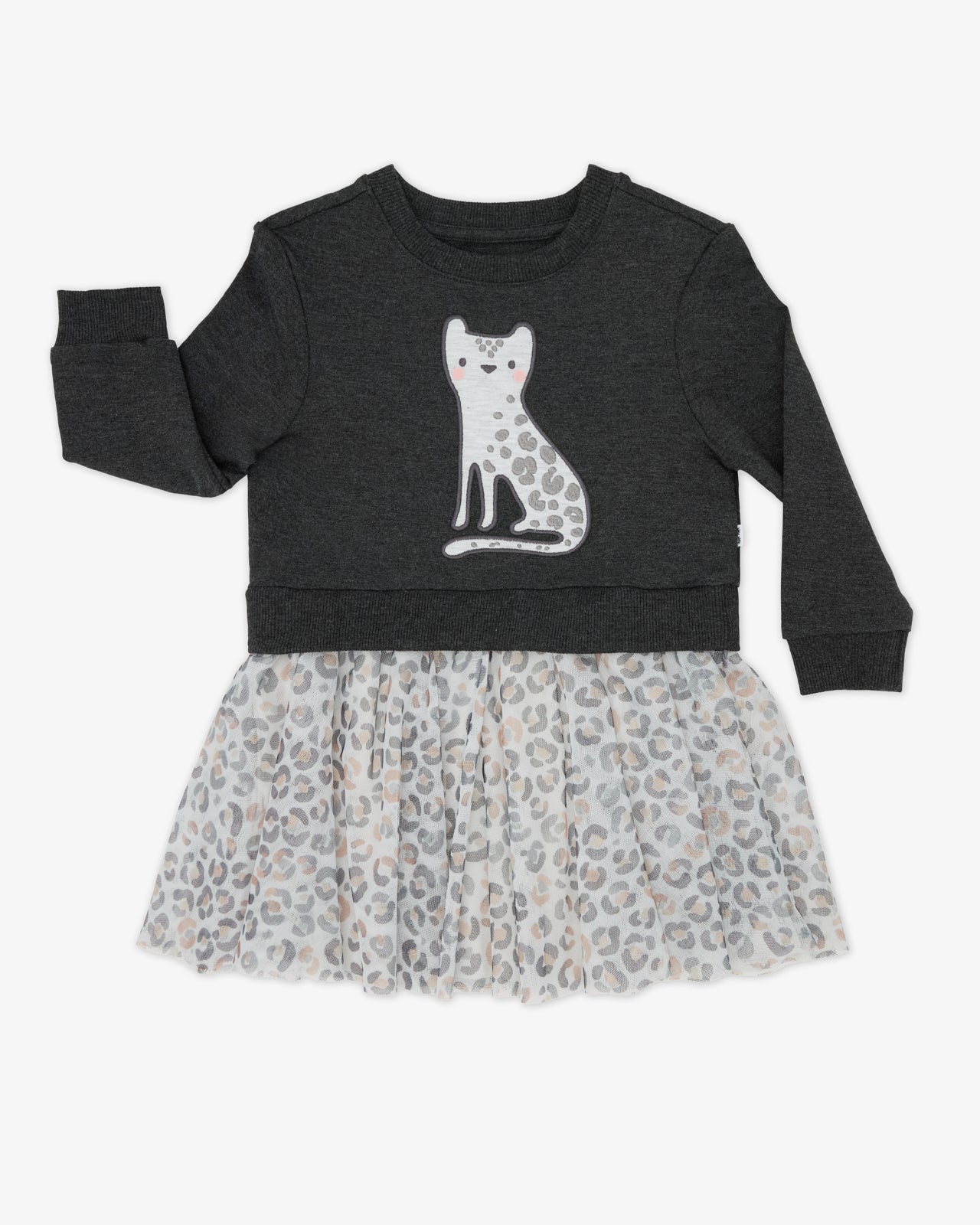 The Snowy Leopard Crewneck Tutu Dress is heather black with an embroidered snow leopard on the chest. The attached tutu skirt is light gray with a black. brown. and gray leopard print.