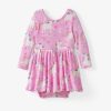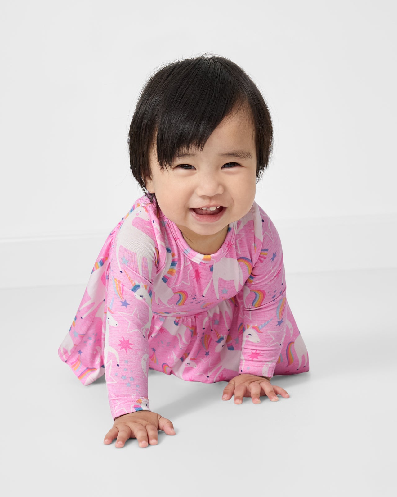 Dance through the day! Made from super-soft and durable Soluxe® Bamboo. the Unicorn Dance Twirl Dress with Bodysuit features dancing unicorns. rainbows. and stars. With a full skirt and hidden snappable bodysuit for easy changes. it’s as comfy as it is cute. Perfect for special occasions & sibling matching!