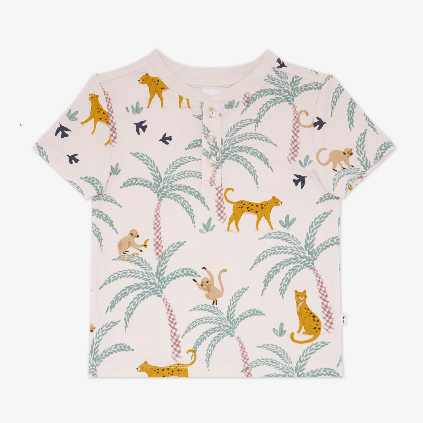 The Wild Escape print features leopards. monkeys. birds. and palm trees on a light beige background.